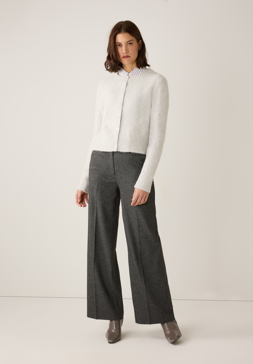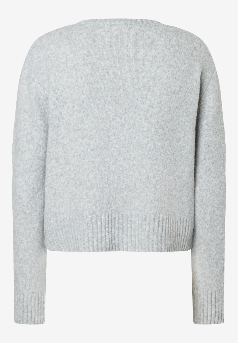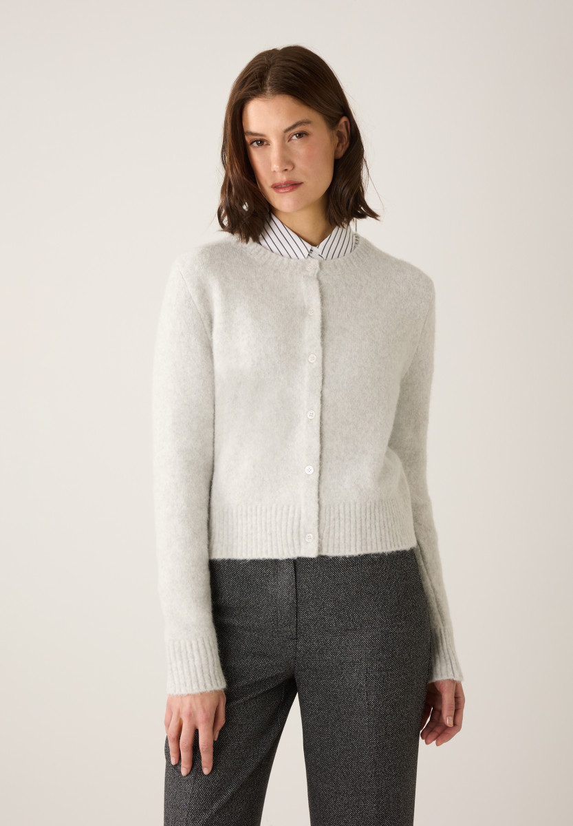 Kurze, gerade Form | Runder Ausschnitt | Durchgehende Knopfleiste | Lange Ärmel | Rippstrickbündchen an den Abschlüssen