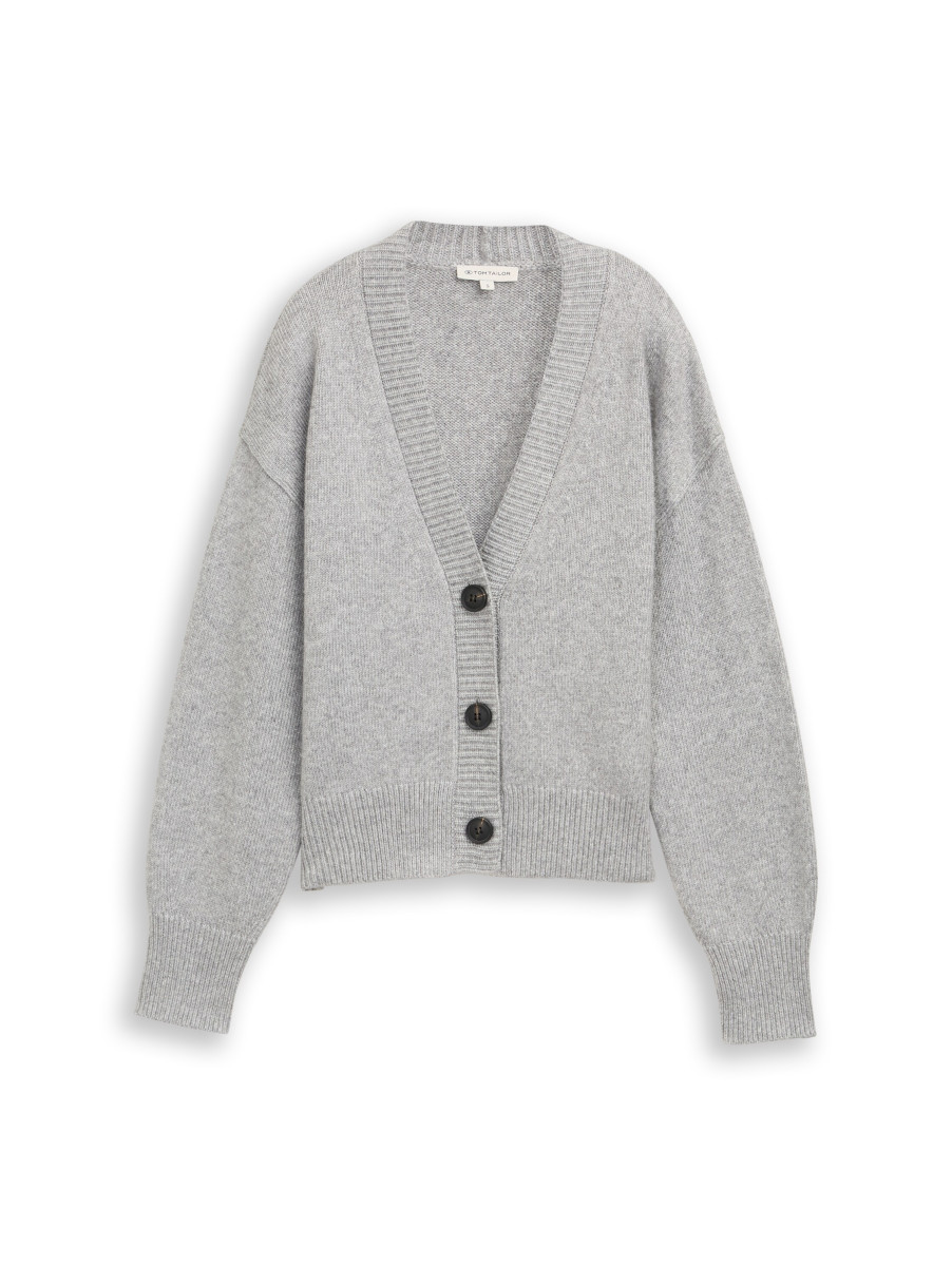 Strickjacke mit V-Ausschnitt und Knopfleiste. Mit überschnittener Schulternaht für eine lockere Passform.