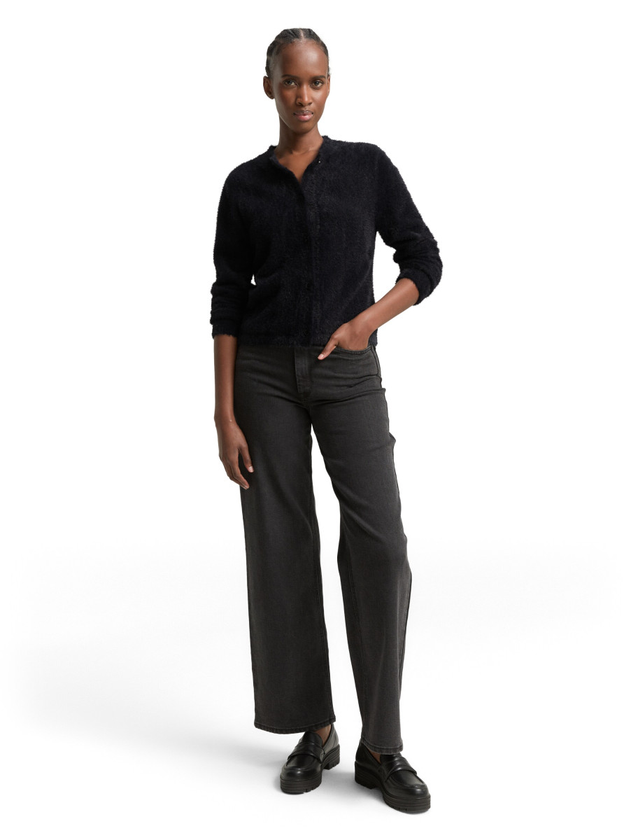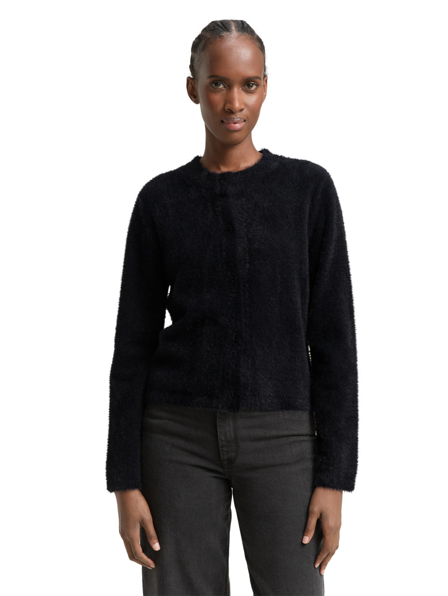 Federgarn-Strickjacke mit Rundhalsausschnitt und Knopfleiste. Aus einem weichen und flauschigen Strickmaterial.