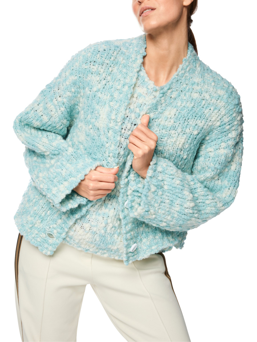 Grobstrickjacke – "Knitted in Germany" | Locker geschnittene Grobstrickjacke im Oversize-Look mit Zwei-Knopf-Verschluss. Aus Schurwolle-Polyamid-Mix – angenehm wärmend und formstabil. Am Standort Deutschland gestrickt und auch veredelt. Die Weiterverarbeitung der einzelnen Teile erfolgt in europäischen Partnerbetrieben. Damit ist das Modell „Knitted in Germany“ | Oversize | Knitted in Germany | Mit zwei Knöpfe | Wärmend | Das Model ist 179 cm groß und trägt N3/38.