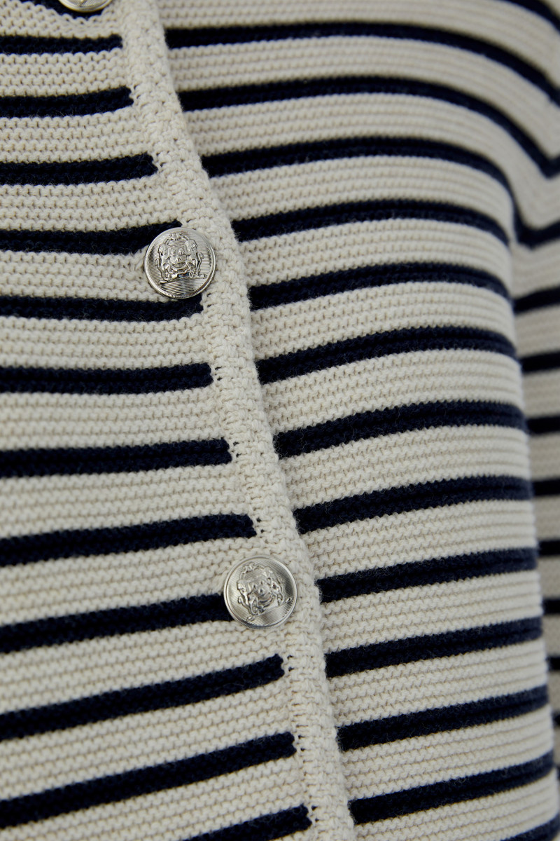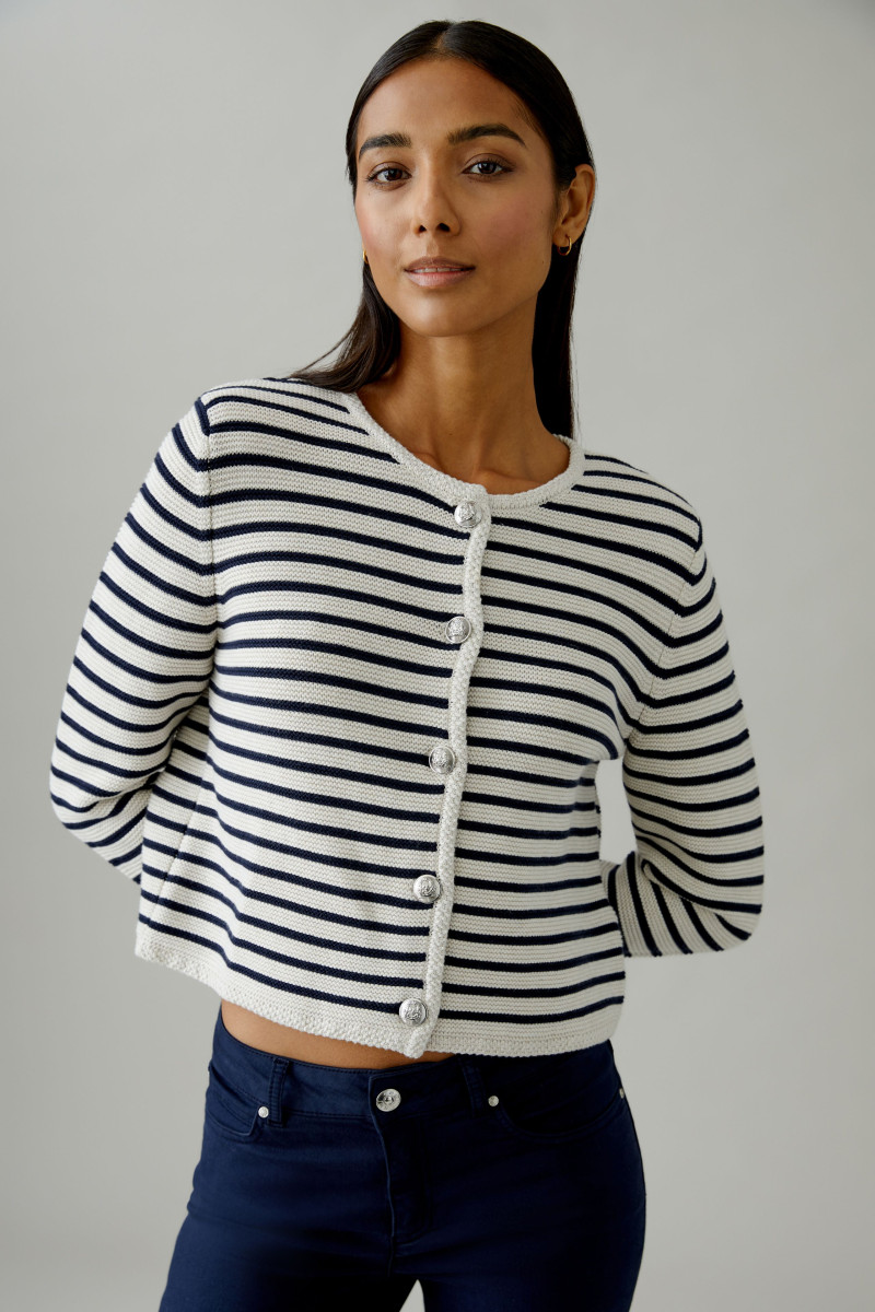 Reine Baumwolle in Streifen links/links gestrickt für einen wertigen 3-D Effekt Gerade und kurz geschnitten In Ricecorn Technik gestrickte Blenden an den Abschlüssen Durchgehende Knopfleiste, wertige Knöpfe mit Wappenmotiv Mit dezenten Schulterpolstern * Länge bei Größe 36: 46cm
