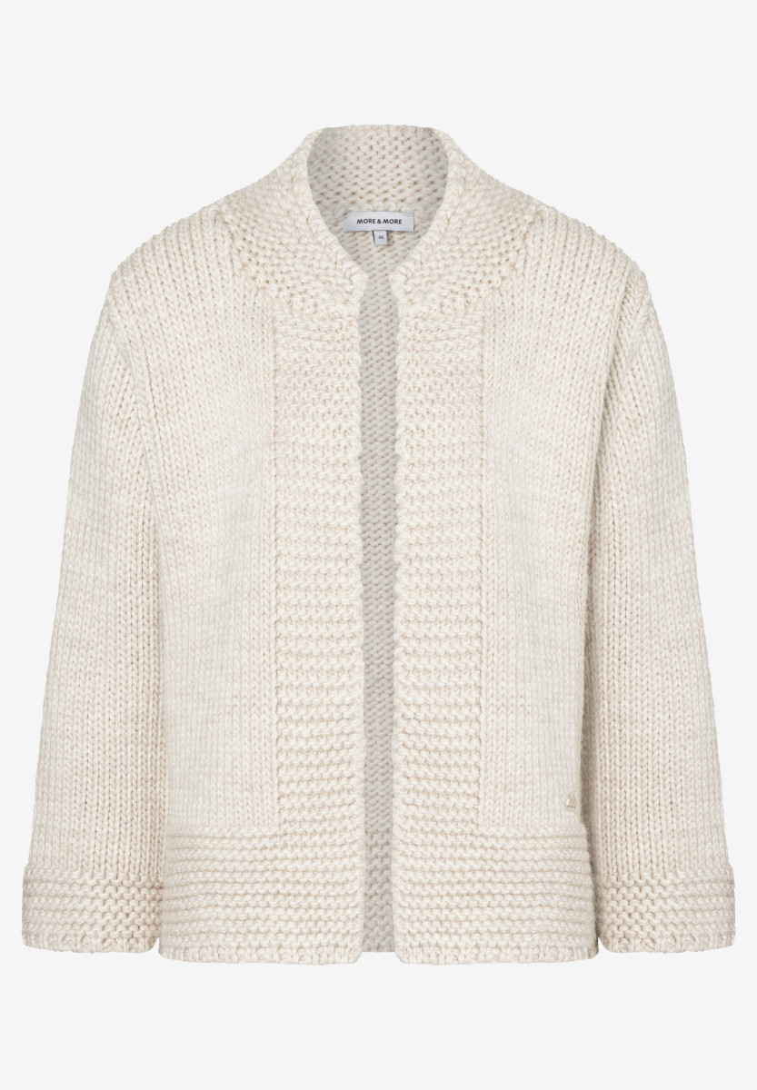 Der moderne Cardigan von MORE & MORE mit 3/4 langen Ärmeln und raffiniertem Links- und Rechtsstrick-Mix bietet viele Stylingmöglichkeiten und sieht sowohl zu Kleidern und Röcken, als auch zu Hosen sehr gut aus.