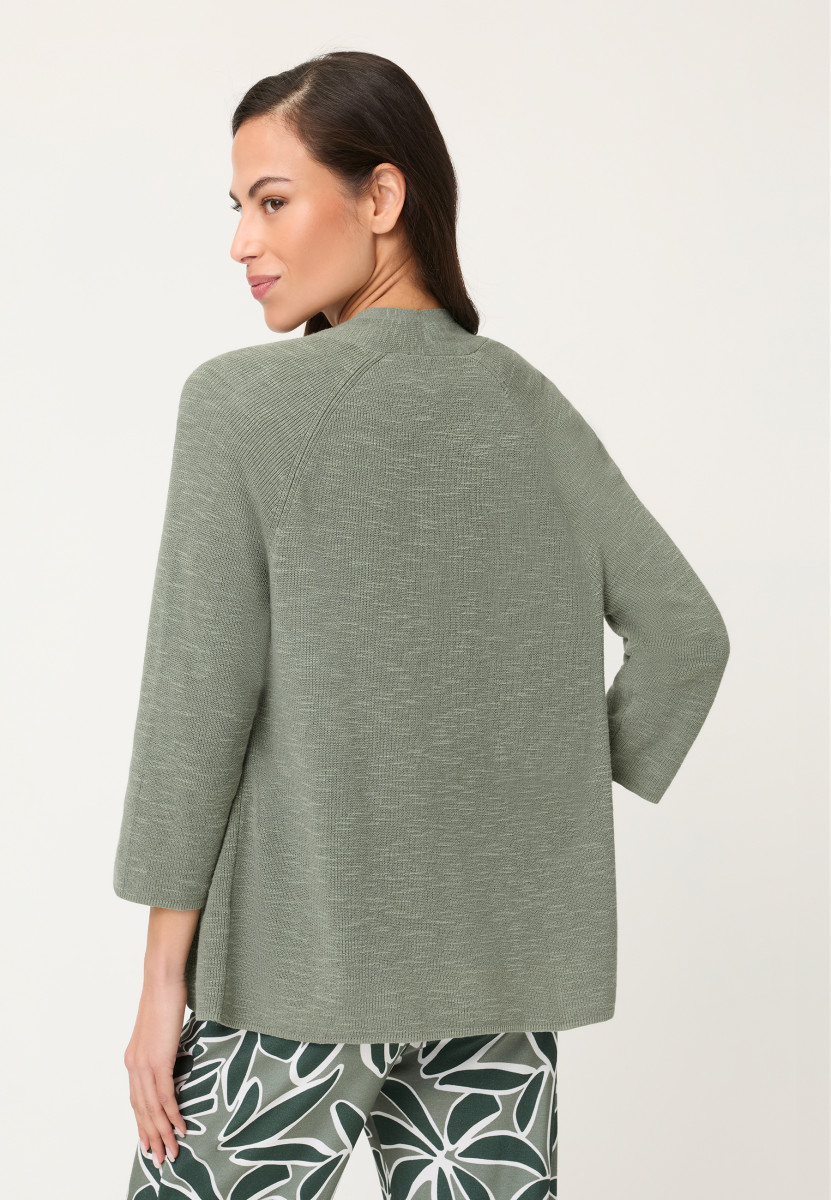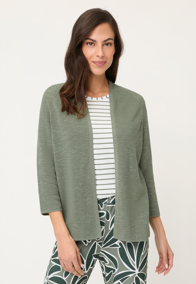 Dieser Cardigan überzeugt mit einem zeitlosen, cleanen Design und vielseitiger Kombinierbarkeit. Der weich fallende Schalkragen unterstreicht die feminine Linie, während die 3/4-Ärmel mit Raglanform für eine entspannte, moderne Silhouette sorgen. Die offene Form verleiht dem Modell eine lässige Leichtigkeit und macht es zum idealen Layering-Piece für jeden Tag. Der angenehm softe Materialmix rundet den komfortablen Look ab. Länge ca. 58 cm.Lief.-Art-Nr: 11004852