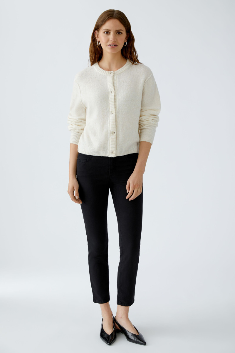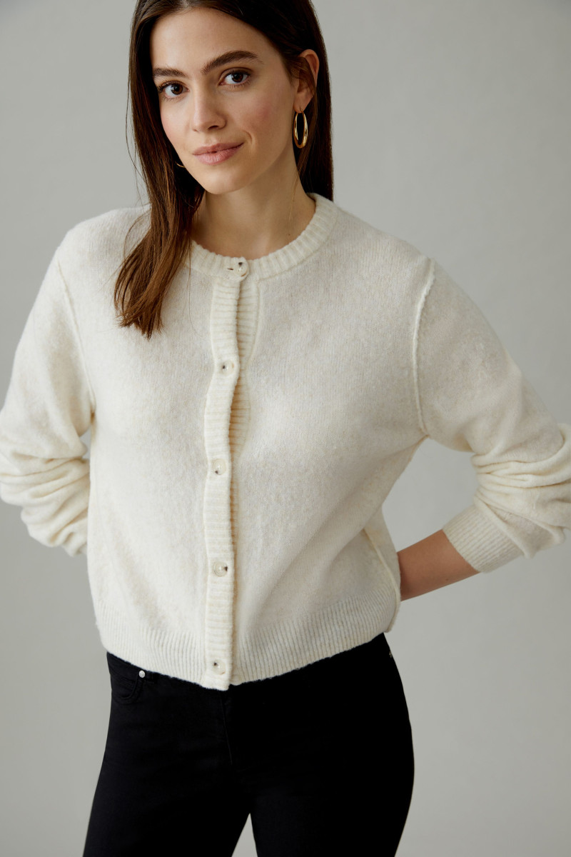Kuschelig, weiche Garnmischung mit Wolle | Glatt gestrickt | Lässig geschnitten, in leicht verkürzter Länge | Rundhals mit gedoppeltem Strickbündchen | Durchgehende Knopfleiste mit wertigen Knöpfen in Hornoptik | Langarm, Strickbündchen mit Elasthan