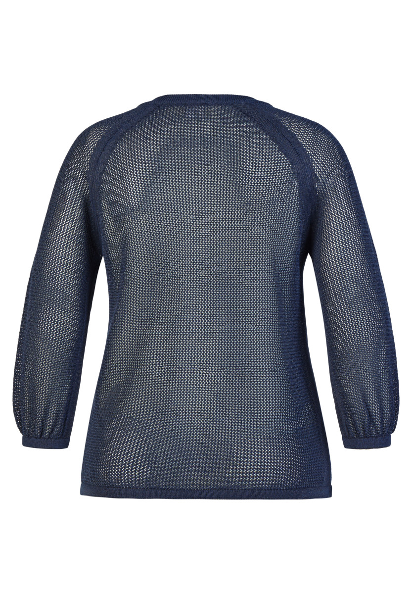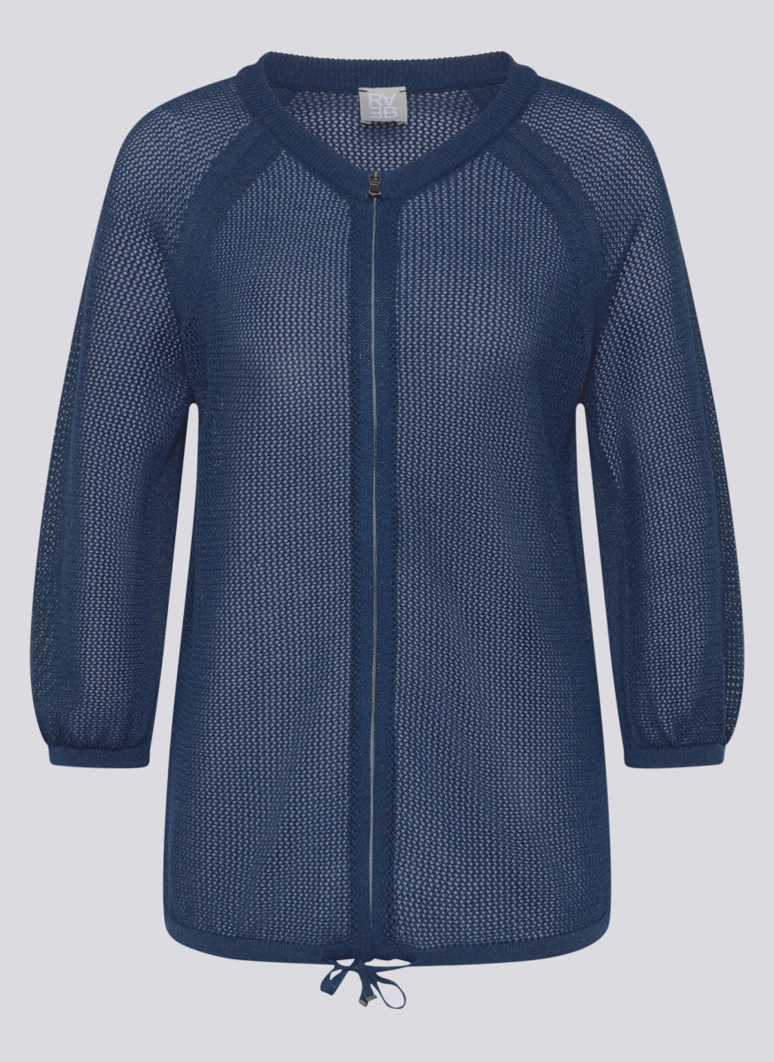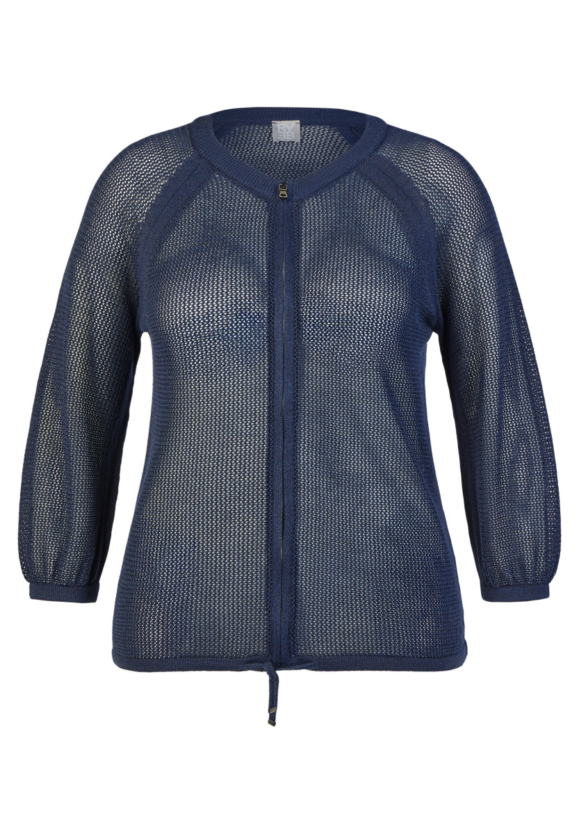 Die transparente Netzstruktur verleiht dieser Strickjacke eine leichte, sommerliche Ausstrahlung. Ein durchgehender Reißverschluss sorgt für eine klare Linie, während Raglanärmel den sportiven Charakter betonen. Der Saum lässt sich mit einem Bindeband individuell regulieren und sorgt für einen lockeren Sitz; 3/4-Ärmel mit elastischem Abschluss runden das Design funktional ab.Lief.-Art-Nr: 56-121522