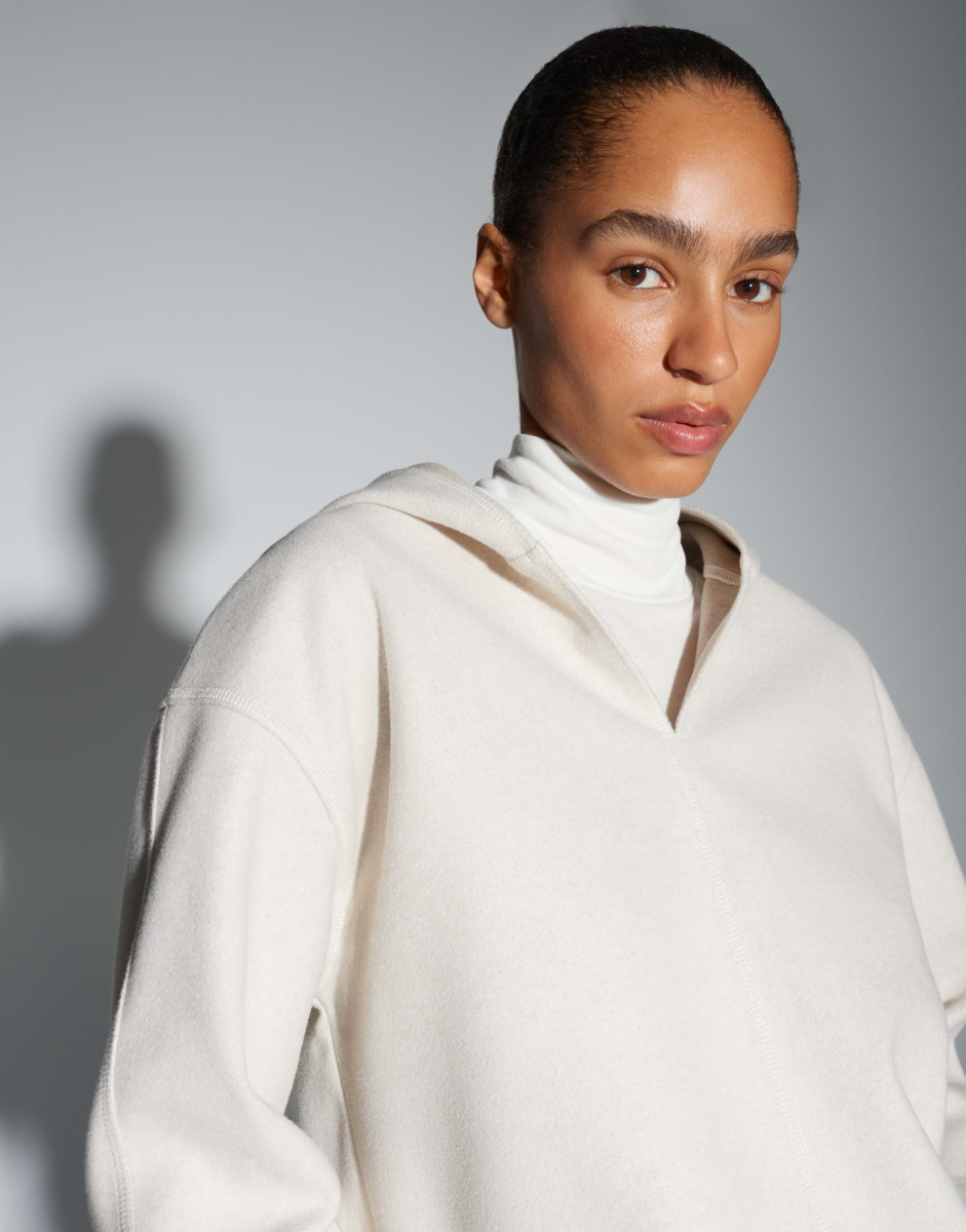 Weite Passform | Boxy Silhouette | Überschnittene Schulter mit Langarm | Kapuze | Weicher Griff | Formstabil | Sweatware | Aufgeraute Struktur | Markante Overlocknähte