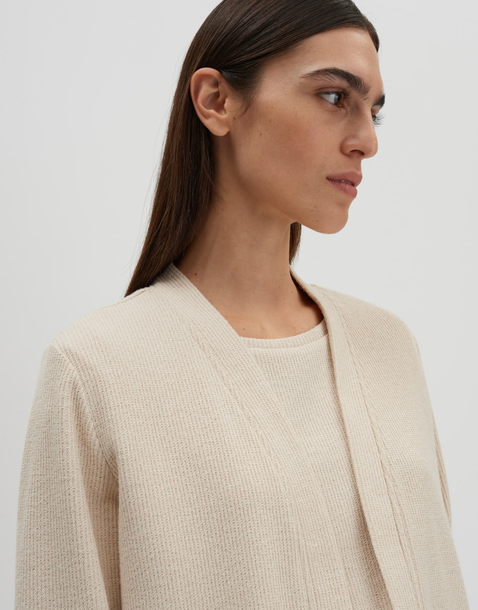 Lockere Passform | Gerader Schnitt | Verkürzte Länge | 3/4 Arm | Rückenlänge ca. 54 cm bei Größe 36 | Model Größe 176 cm – trägt Größe 36 | Sweatware | Feine Rippstruktur | Weicher Griff | Elastischer Stoff | Weich fließender Fall | Offene Front