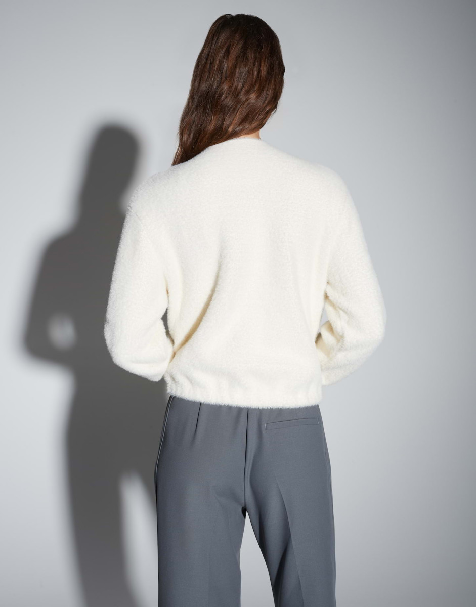 Das Design ist minimalistisch und elegant gehalten: Die Jacke kommt ohne Kragen aus und besitzt einen klassischen Rundhalsausschnitt. Ein durchgehender, silberfarbener Reißverschluss dient als praktischer Verschluss und setzt einen dezenten Akzent. Der lockere, leicht kastige Schnitt wird durch die überschnittenen Schultern und die voluminösen Ärmel betont, was eine entspannte, aber stilvolle Silhouette schafft.