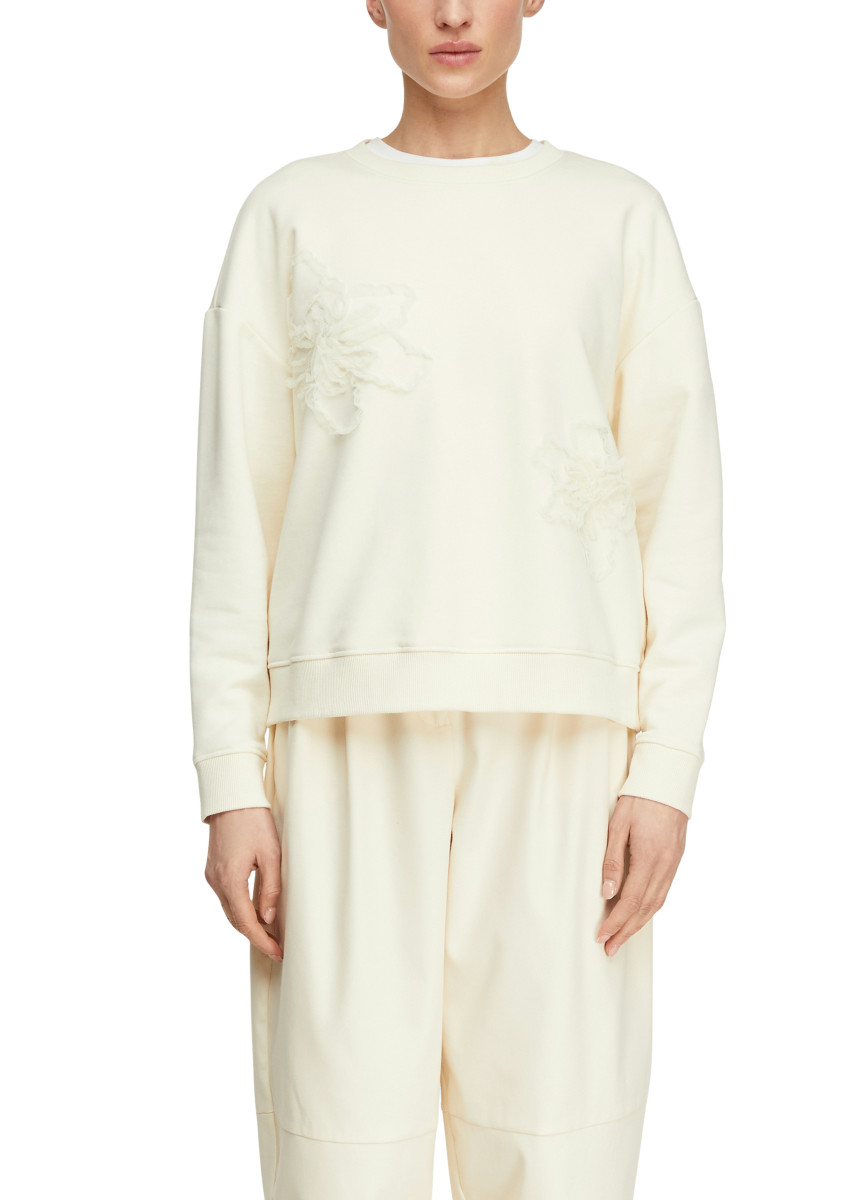 Dieses Sweatshirt mit bezaubernder Blumenapplikation vereint lässigen Komfort mit femininem Charme. Der Rundhalsausschnitt und die Rippbündchen an Ärmeln sowie Saum sorgen für eine moderne Relaxed Fit Silhouette. Feine Stickereien und dekorative Spitzendetails verleihen dem Casual-Piece eine verspielte Note. Kombinieren Sie es zu Jeans für den entspannten Alltag oder dressen Sie es mit einer eleganten Hose für besondere Anlässe auf. Ein vielseitiger Begleiter für stilbewusste Frauen.Lief.-Art-Nr: 2178267