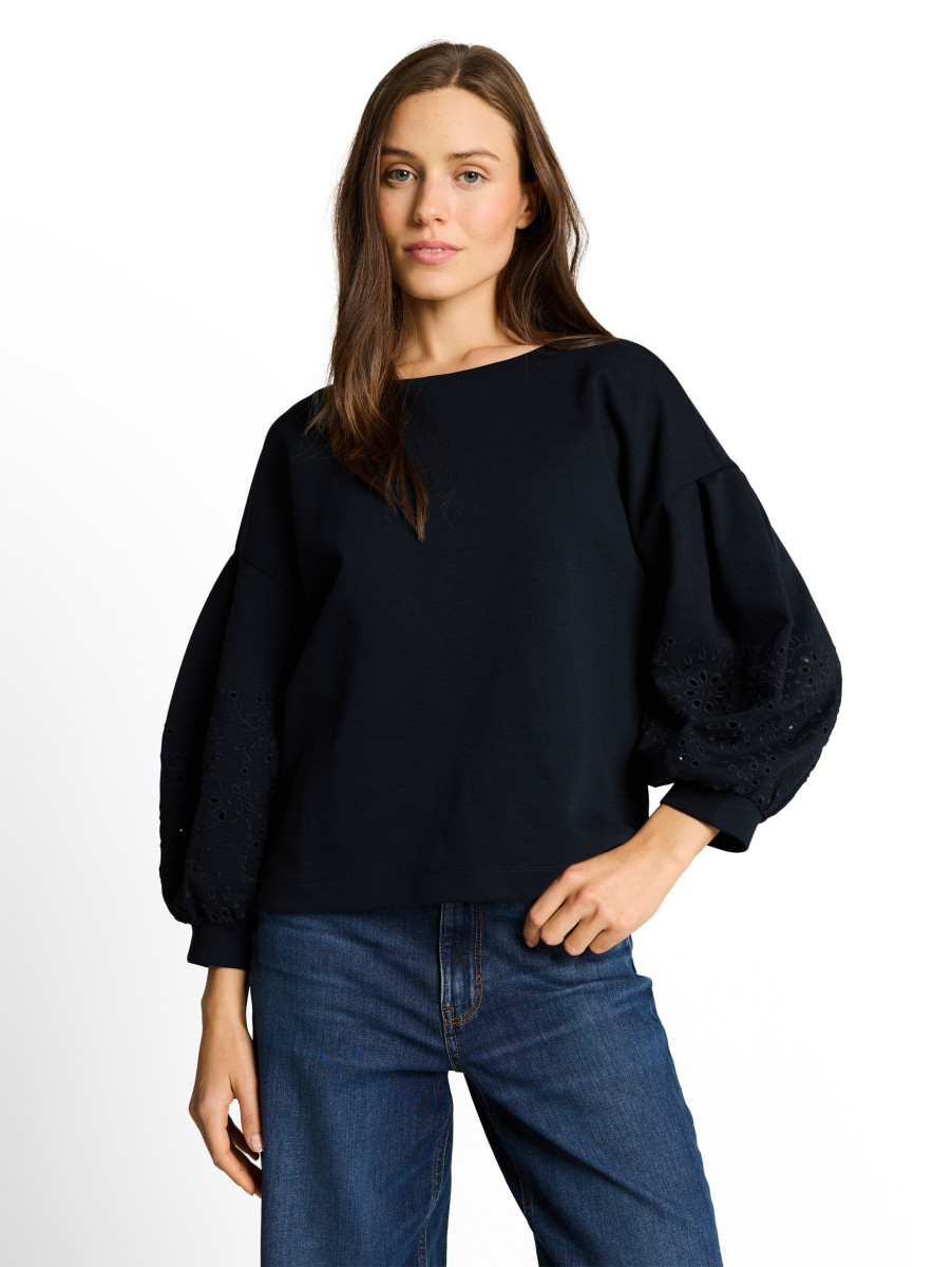 Dieses locker geschnittene Sweatshirt verfügt über einen U-Boot-Ausschnitt und eine überschnittene Schulternaht, die für eine entspannte Silhouette sorgen. Seitenschlitze setzen modische Akzente und erhöhen den Tragekomfort. Die gerafften Ärmel mit Lochstickmuster verleihen dem Modell eine feminine, verspielte Note und machen es zu einem vielseitigen Begleiter im Alltag.Lief.-Art-Nr: 1050497