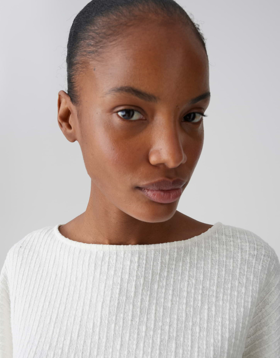 Das weiche Sweatshirt besticht durch eine weite, boxy Passform und eine verkürzte Länge mit kleinen seitlichen Schlitzen. Fledermausärmel in 3/4-Länge und ein U-Boot-Ausschnitt sorgen für einen lässigen Look, während die dezente Streifenstruktur dem Modell subtile Struktur verleiht. Mit einer Rückenlänge von ca. 55 cm (bei Größe 36) lässt sich das vielseitige Teil leicht kombinieren und eignet sich für entspannte Alltagsoutfits.Lief.-Art-Nr: 10536513997418