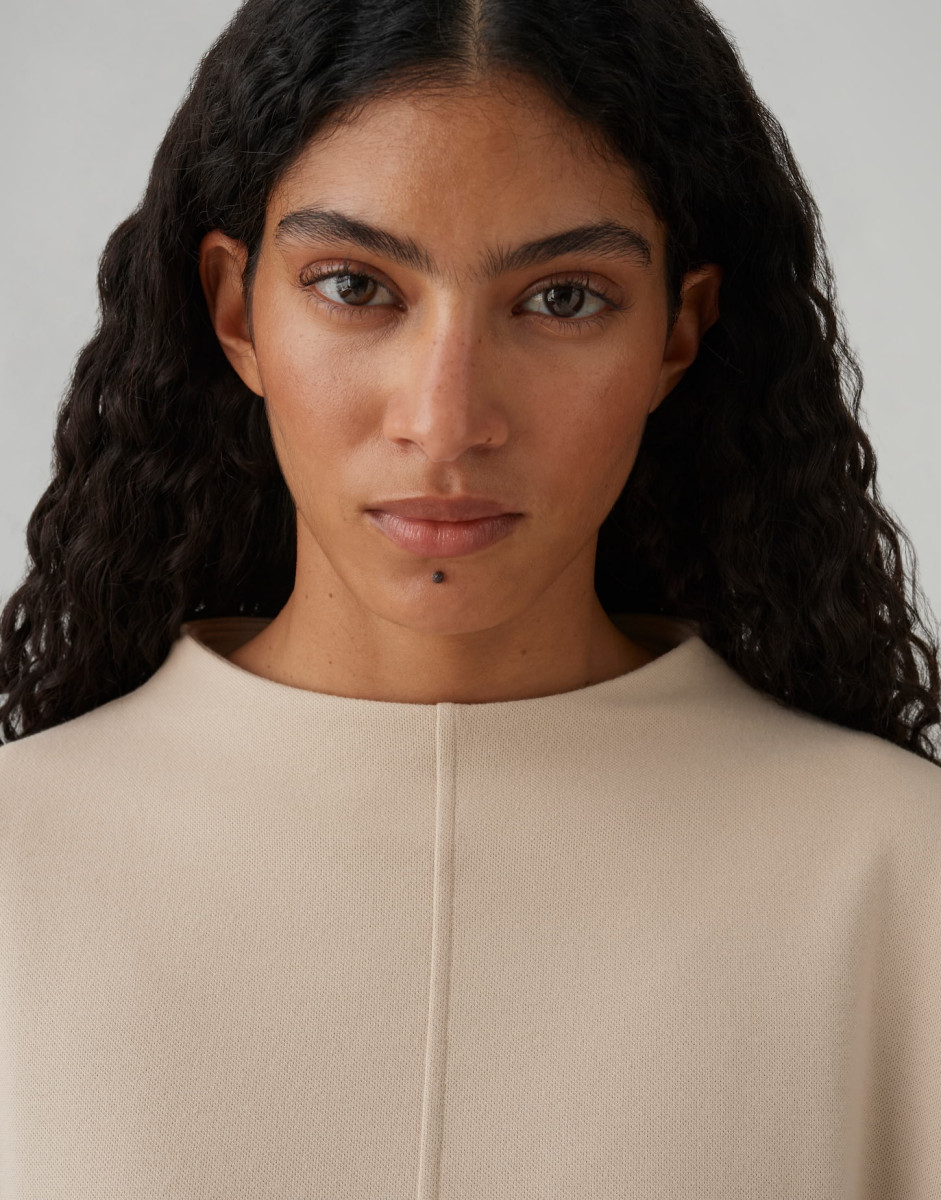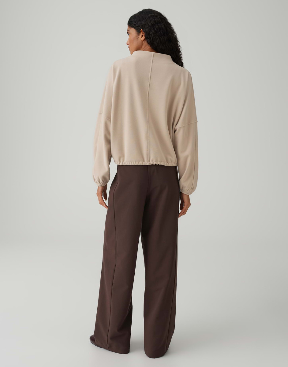 Dieses Oberteil überzeugt mit einer weiten Passform und einem schmal zulaufenden Schnitt, der eine moderne, lässige Silhouette schafft. Der leicht verkürzte Schnitt sorgt für einen zeitgemäßen Look und lässt sich ideal mit hoch geschnittenen Hosen oder Röcken kombinieren. Überschnittene Schultern mit langen Ärmeln verleihen dem Design eine entspannte Note, während der Funnel Neck für einen stilvollen, sportlich-eleganten Akzent sorgt. Gefertigt aus hochwertiger Sweatware bietet das Modell dank elastischem Stoff ein angenehmes Tragegefühl und optimale Bewegungsfreiheit. Der weiche Griff und die samtige Oberfläche unterstreichen den hohen Komfort. Ein Tunnelzug im Saum mit elastischem Gummibund ermöglicht eine individuelle Anpassung der Passform. Abgesteppte Teilungsnähte setzen dezente Akzente und betonen die sorgfältige Verarbeitung. Die Rückenlänge beträgt ca. 55 cm bei Größe 36. Das Model ist 176 cm groß und trägt Größe 36.Lief.-Art-Nr: 10522713895412