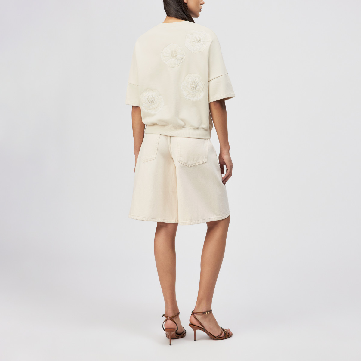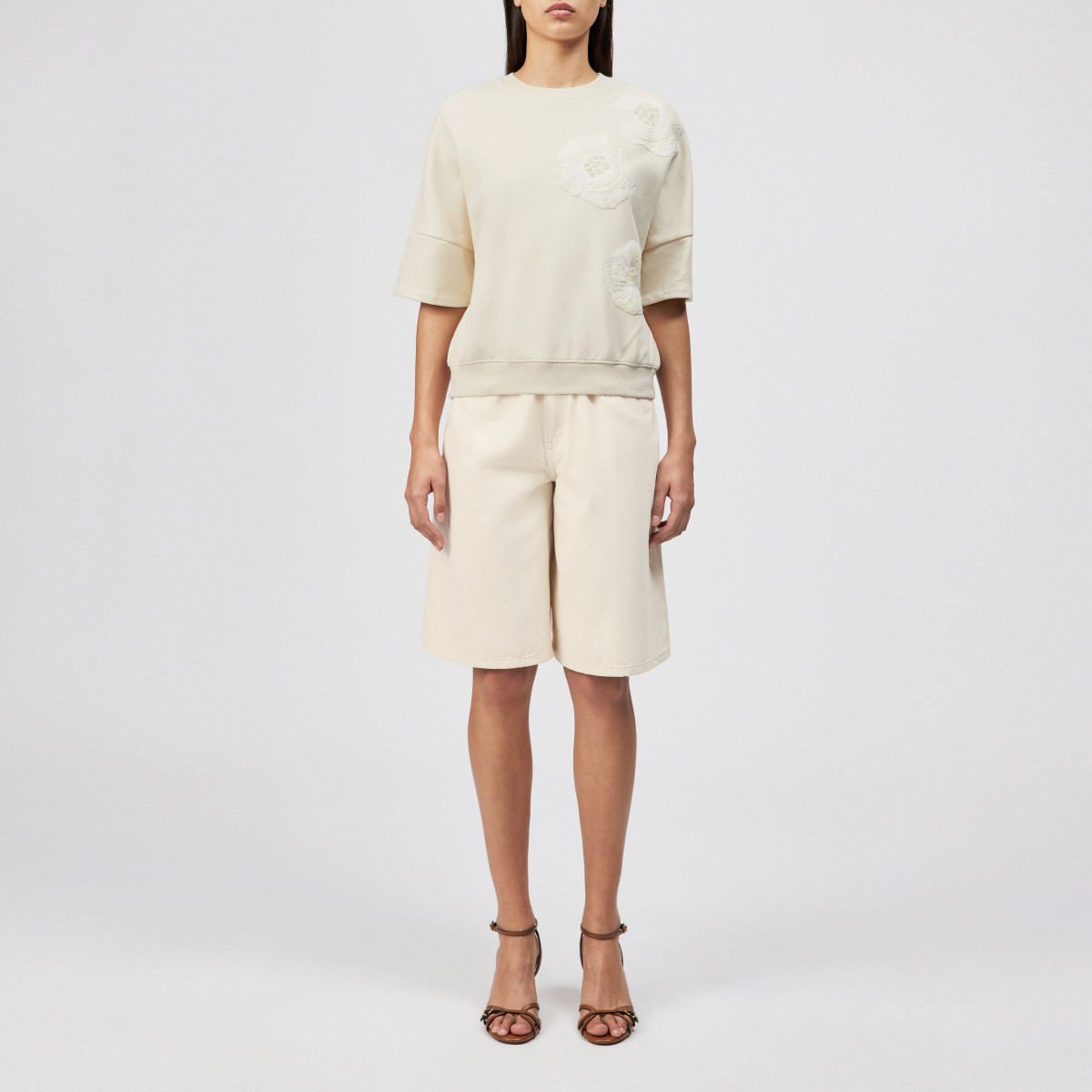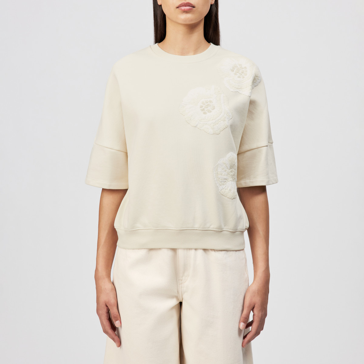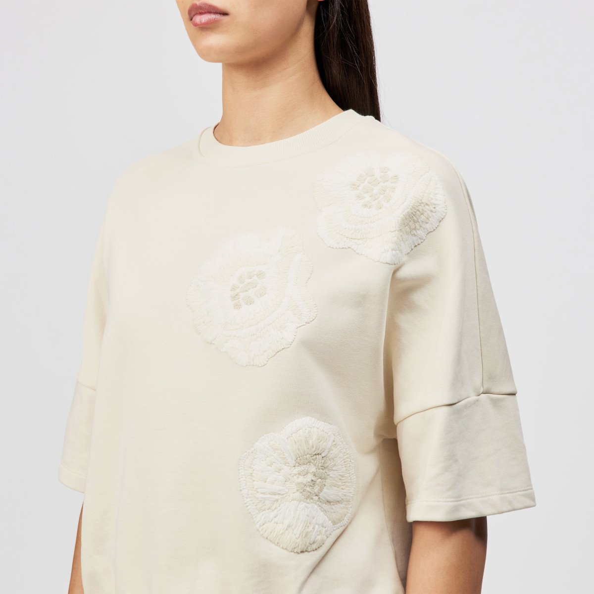 MINDULI_P1 ist ein locker geschnittenes Sweatshirt mit einzigartiger Blumen-Handstickerei in tonigen Farben. Das Sweatshirt mit überschnittenen Schultern, einer kurzer Ärmellänge und Rippenbündchen tritt in lässiger Silhouette auf. Der schwere und cleane Baumwoll Felpa unterstreicht die hochwertige Optik und bringt ein wohliges Gefühl und ansprechende Haptik.