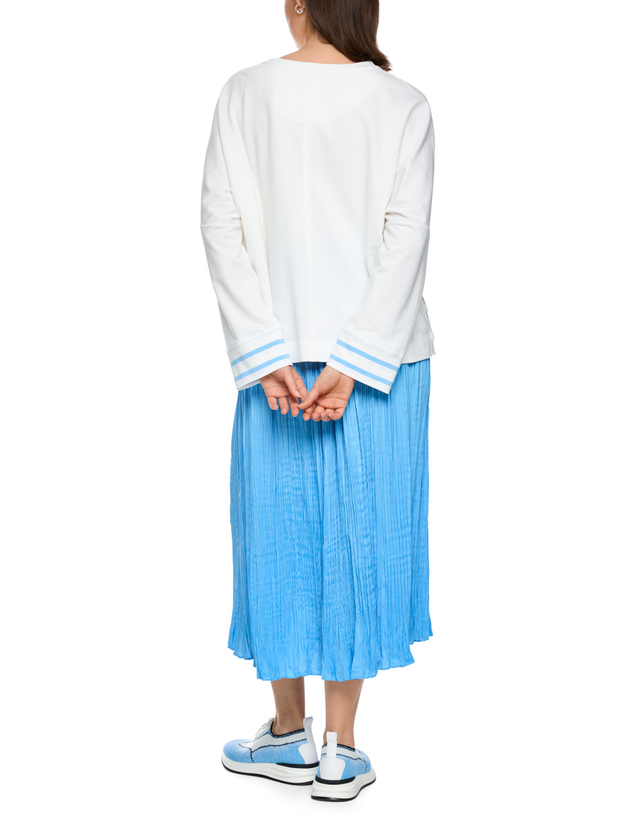 Dieses lässige Sweatshirt in weiter Form hat überschnittene Schultern und einen Rundhalsausschnitt, wodurch es einen entspannten Sitz bietet. Das markante Streifenmuster und die "Ocean"-Stickerei auf der Vorderseite verleihen dem Modell einen maritimen Touch, seitliche Schlitze mit dekorativen Knöpfen setzen zusätzliche Akzente. Der weiche Materialmix liegt angenehm auf der Haut und sorgt für hohen Tragekomfort.Lief.-Art-Nr: AS 44.13 J74