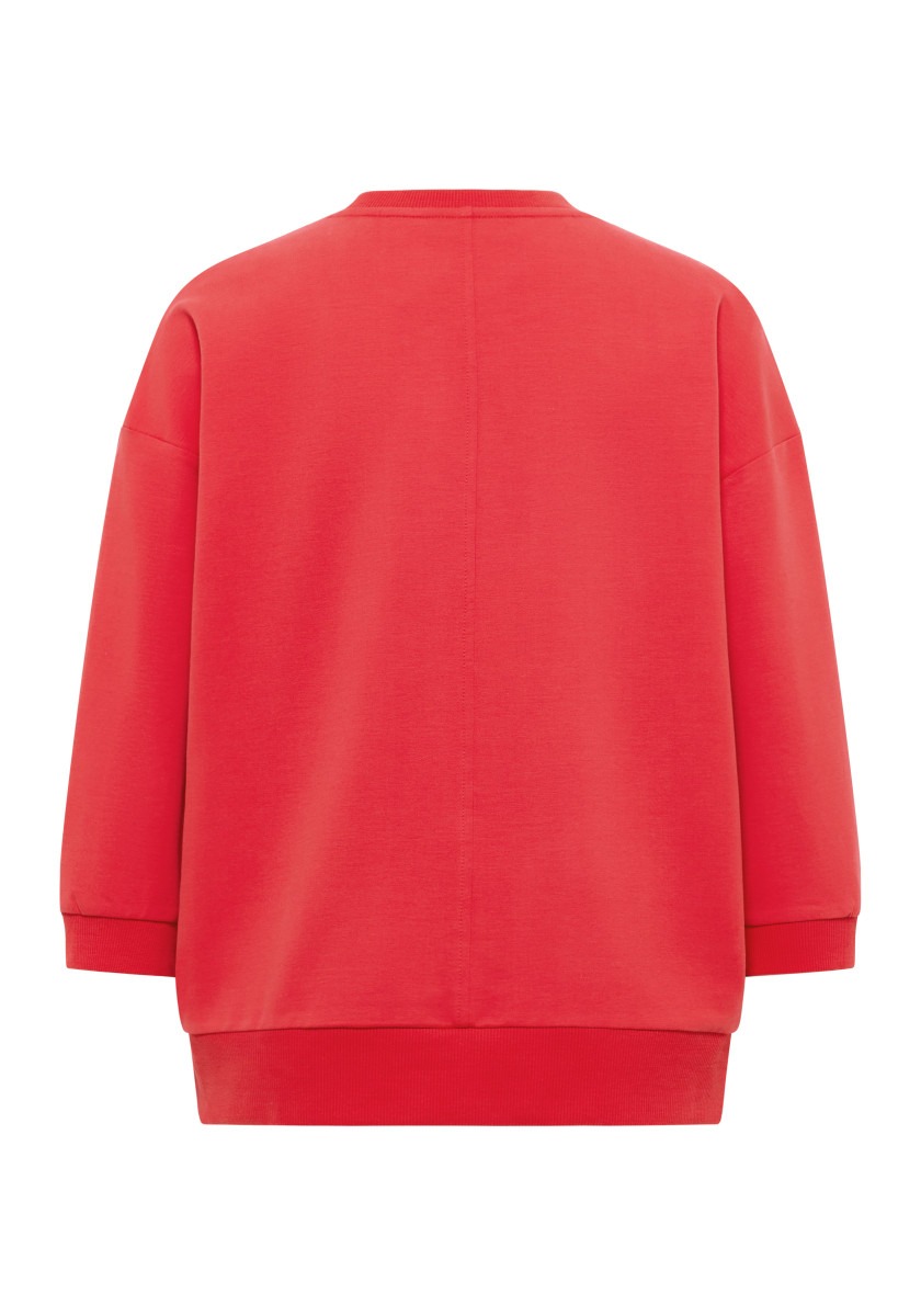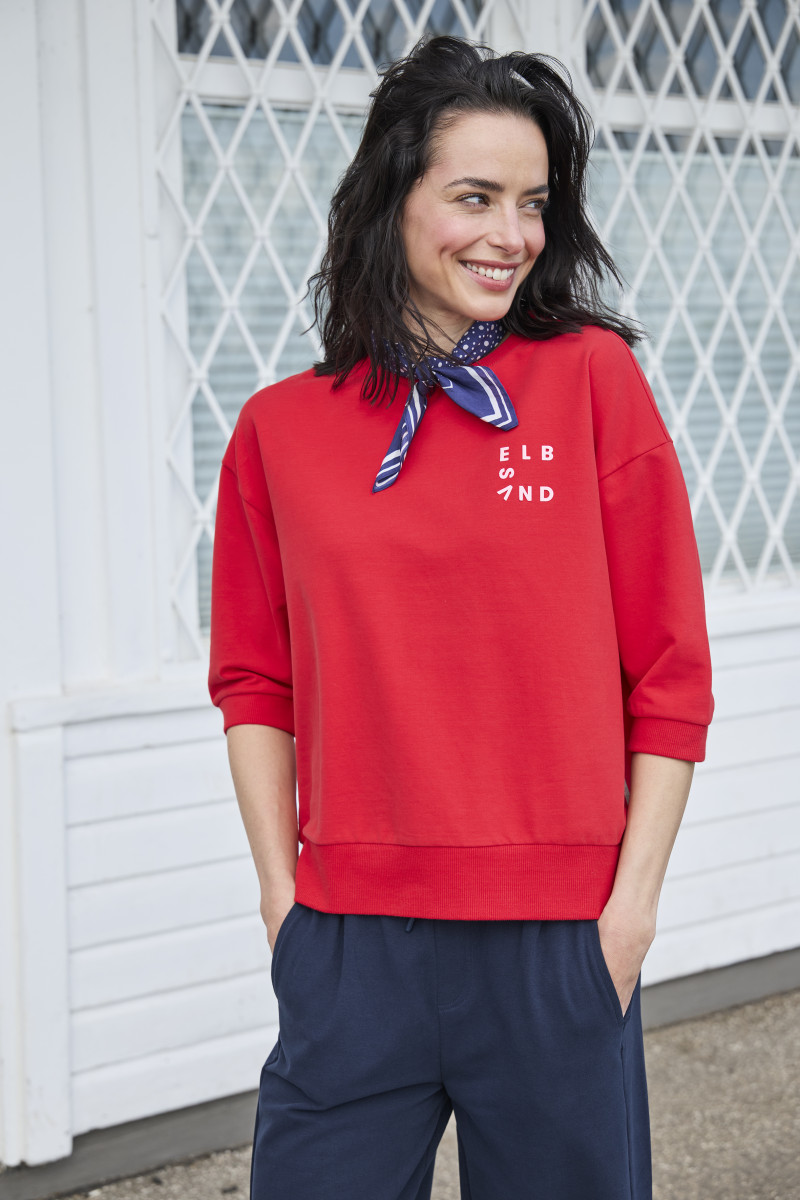 Loose fit, locker geschnittenes Sweatshirt | Weiche, elastische Sweatqualität, kuschelig angeraut, Innenseite gebrusht | Rundhalsausschnitt mit Rippbündchen, leicht überschnittene Schultern, 3/4 Ärmel mit Bündchenabschluss | Kleiner, farblich abgesetzter Rubberrprint auf der Brust | Lässige Form für die Übergangszeit
