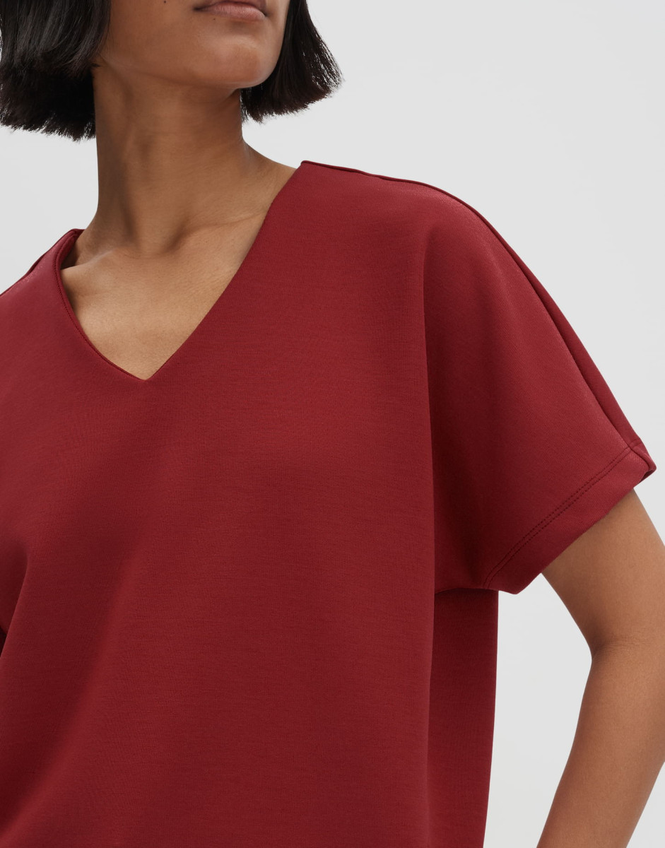 Weite Passform | Schmal Zulaufend | Überschnittener Kurzarm | V-Ausschnitt | Rückenlänge Ca. 59 Cm Bei Größe 36 | Model Größe 176 Cm – Trägt Größe 36 | Sweatware | Dezente Struktur | Weicher Griff | Leicht Elastischer Stoff | Kellerfalte Im Rücken | Passe Im Rücken