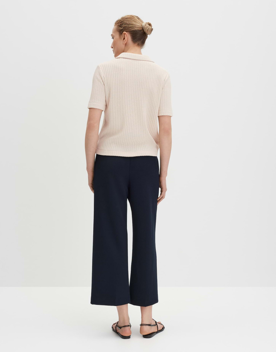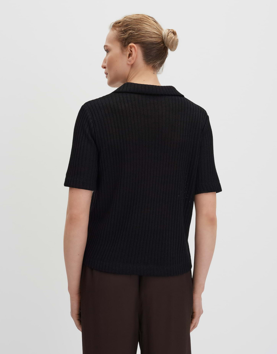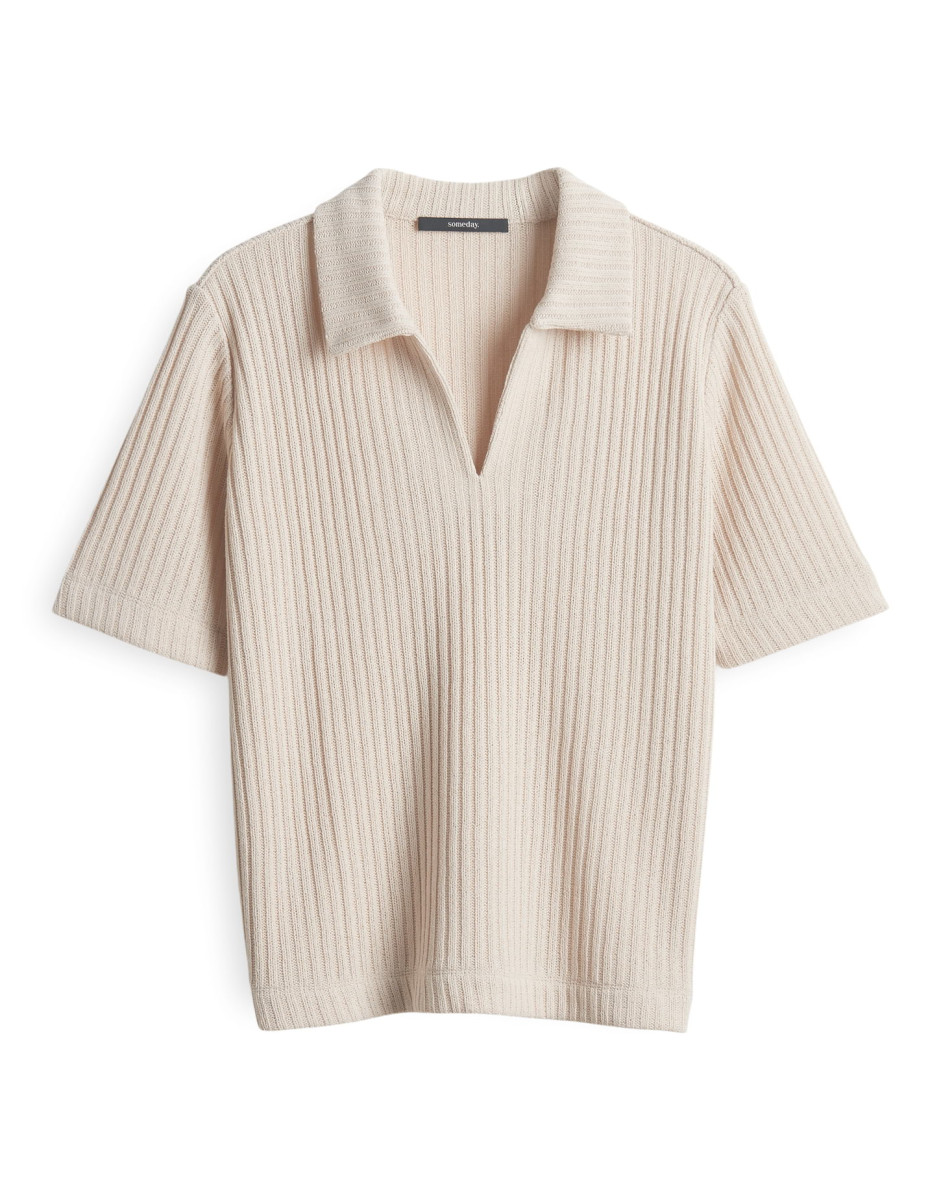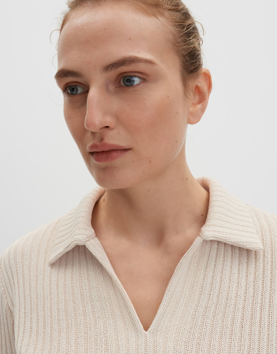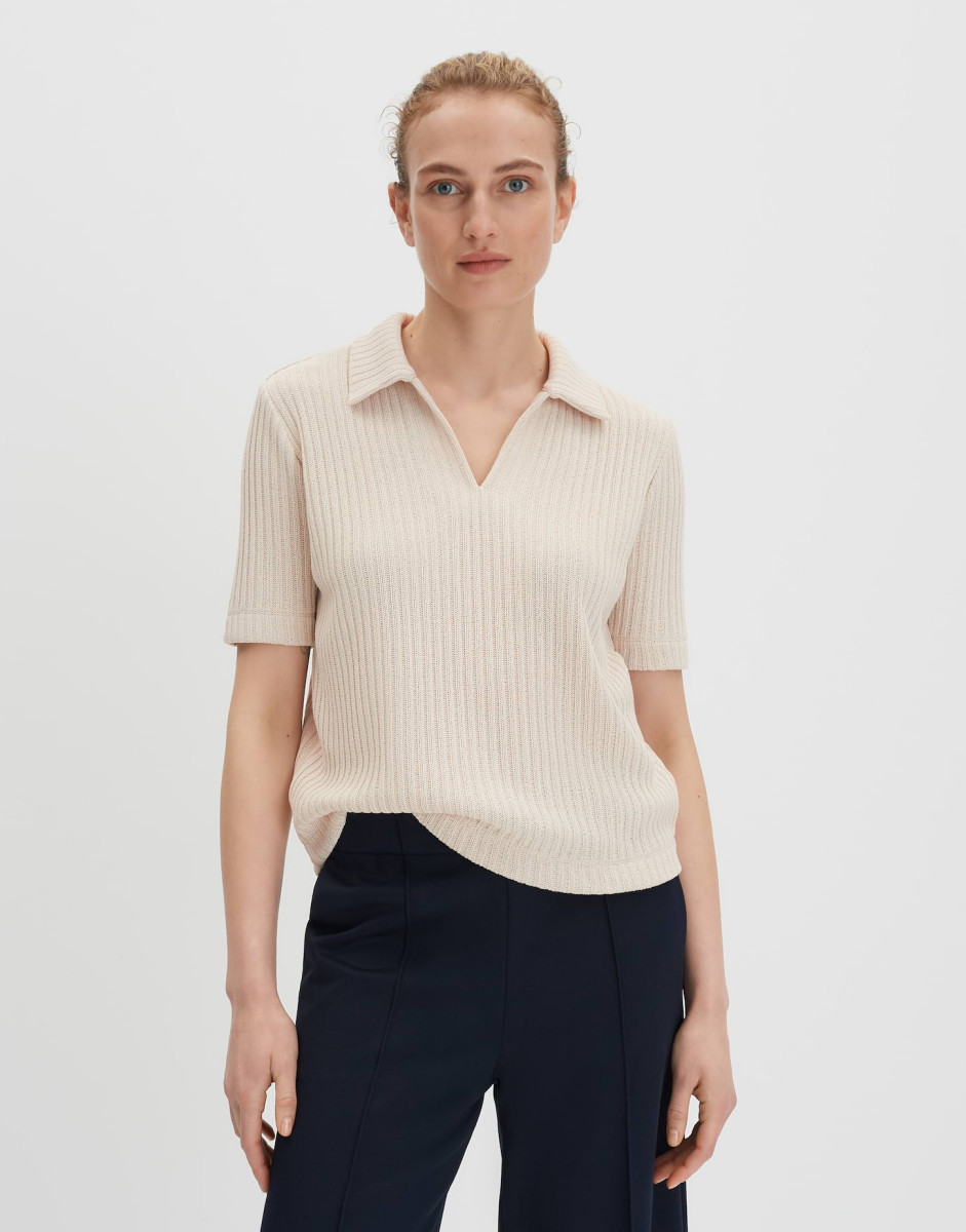 Normale Passform | Gerader Schnitt | Halbarm | V-Ausschnitt | Polokragen | Rückenlänge ca. 54 cm bei Größe 36 | Model Größe 178 cm – trägt Größe 36 | Sweatware | Rippstruktur | Natürlicher Griff | Elastischer Stoff