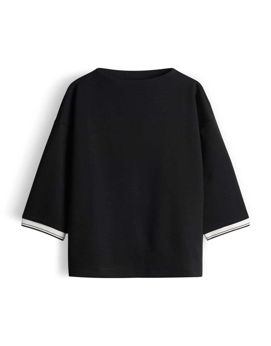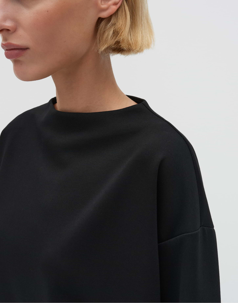 Das Sweatshirt mit überschnittener Schulter und 3/4-Ärmeln überzeugt durch einen modernen Funnel-Neck und eine lockere, gerade Silhouette. Die samtige Oberfläche und der weiche Griff sorgen für angenehmen Tragekomfort, während farblich abgesetzte Rippbündchen dezente Akzente setzen. Die zeitlose Optik lässt sich vielseitig kombinieren und ist ideal für entspannte Alltagslooks.Lief.-Art-Nr: 10513412854106