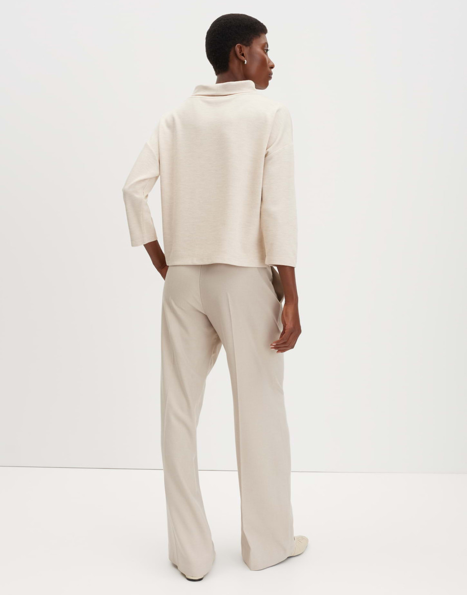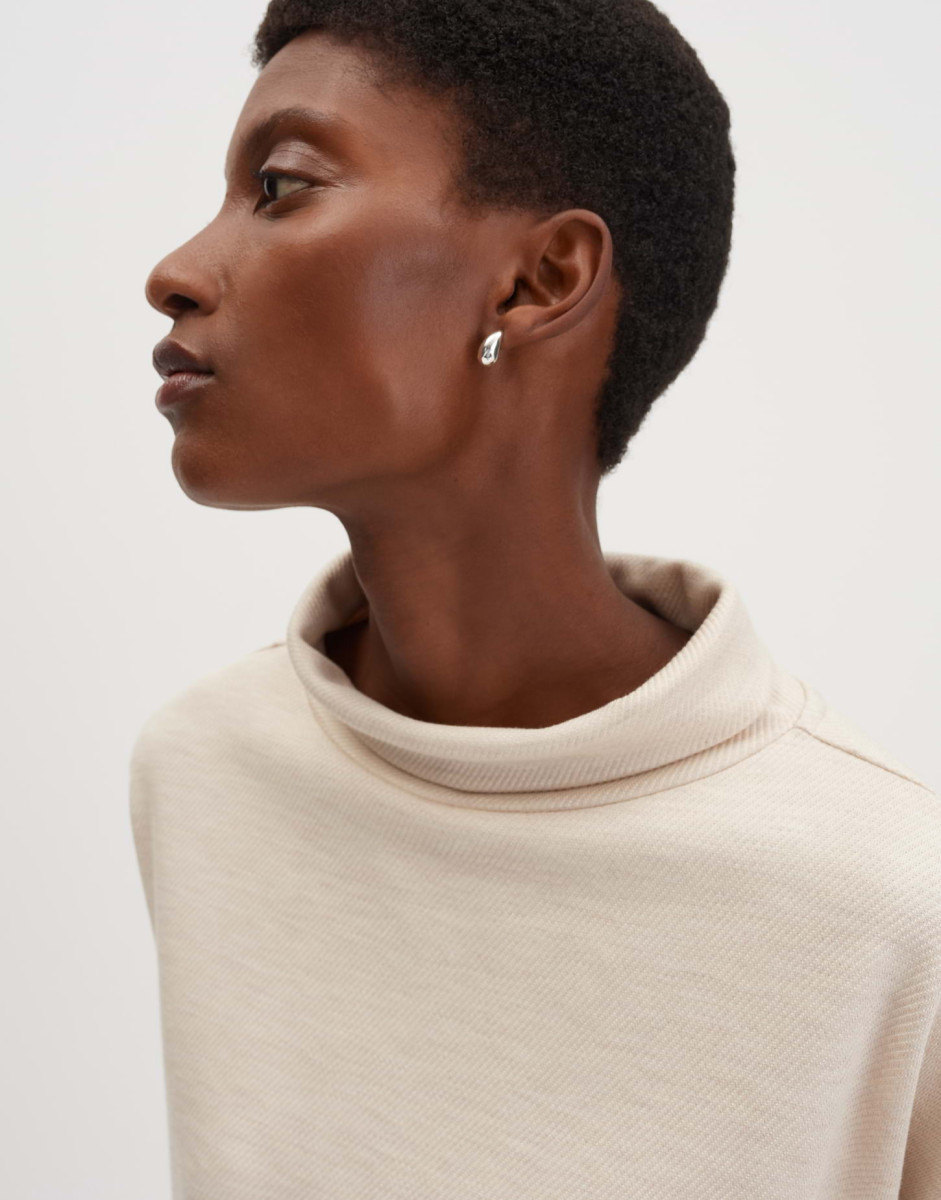 Der Fokus liegt auf der klaren Silhouette und dem markanten Rollkragen (Turtleneck). Dieser ist großzügig und fällt lässig, ohne einzuengen, und bietet optimalen Schutz vor Kälte. Das Material verfügt über eine feine, subtile Struktur (vermutlich ein Feinstrick oder Jacquard-Jersey), die dem schlichten Design eine edle Tiefe verleiht.