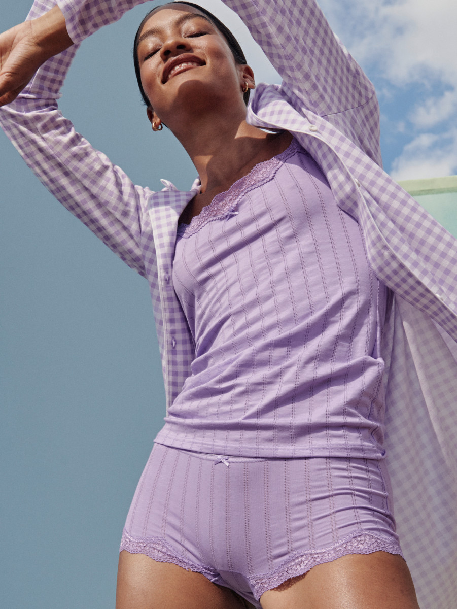 Natürlich hypoallergen und temperaturregulierend | Edle Nadelstreifen-Optik | Verspielt & romantisch | Lange Farbbrillanz | Zarte Spitze & Zierschleifchen am Ausschnitt | Träger individuell verstellbar, nickelfrei