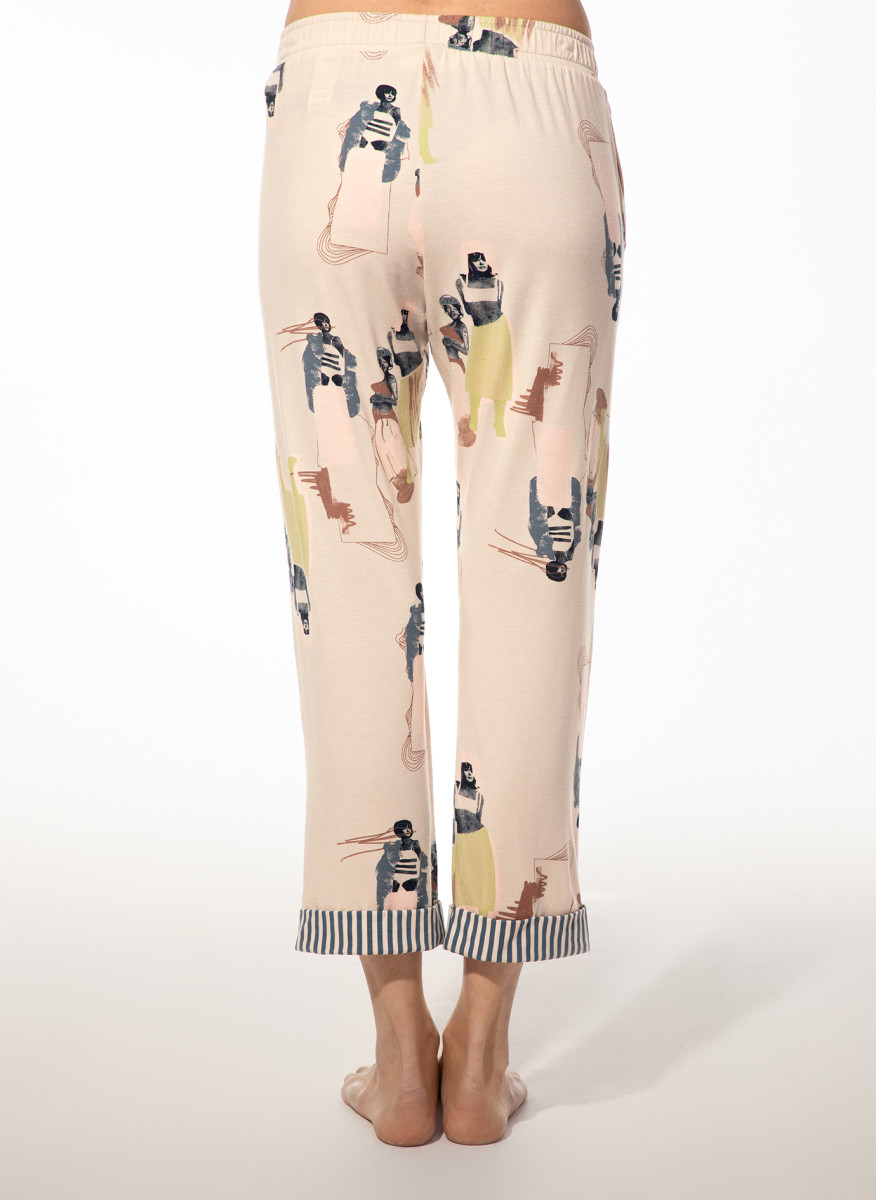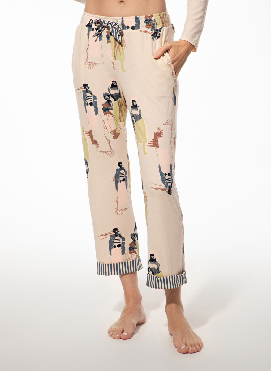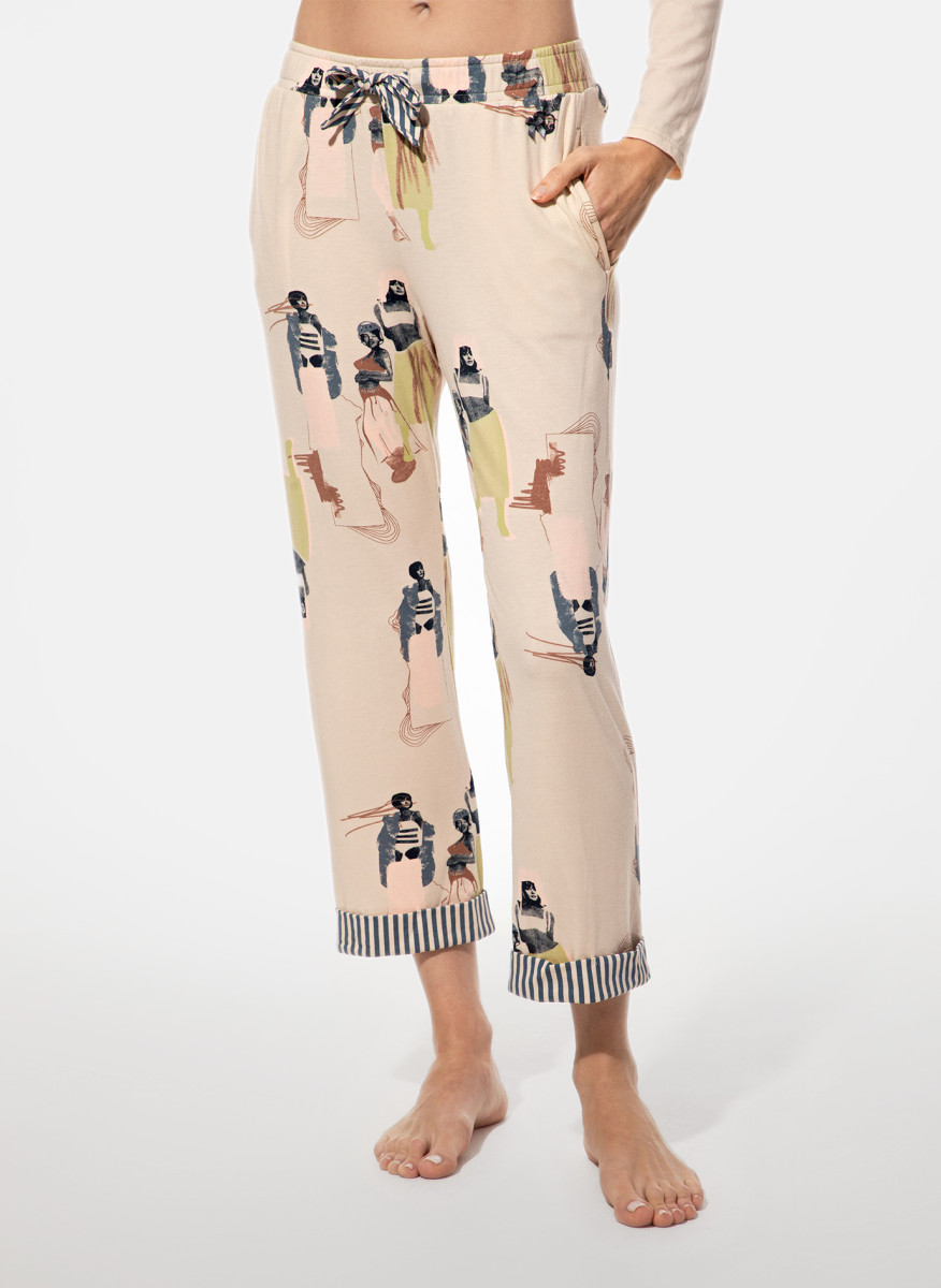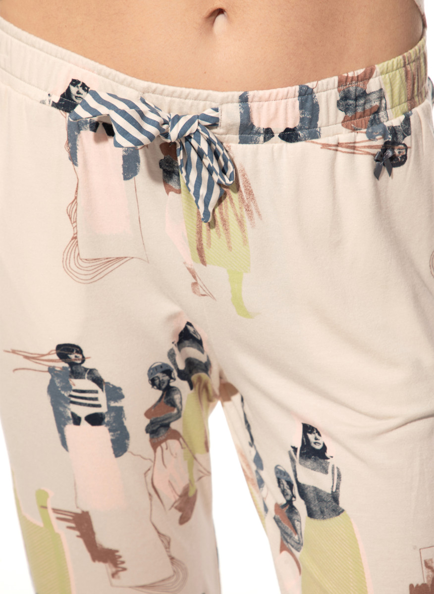 Diese bedruckte Damenhose vereint stilvolle Lässigkeit mit einem verspielten Look. Der kunstvolle Allover-Print in sanften Pastelltönen und das angenehme, leichte Material machen diese Hose zum perfekten Begleiter für warme Tage oder entspannte Stunden zu Hause. Der elastische Bund mit Schleife und die gestreiften Saumabschlüsse verleihen der Hose zusätzlich einen modernen, maritimen Touch.