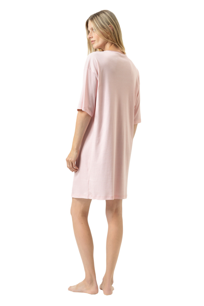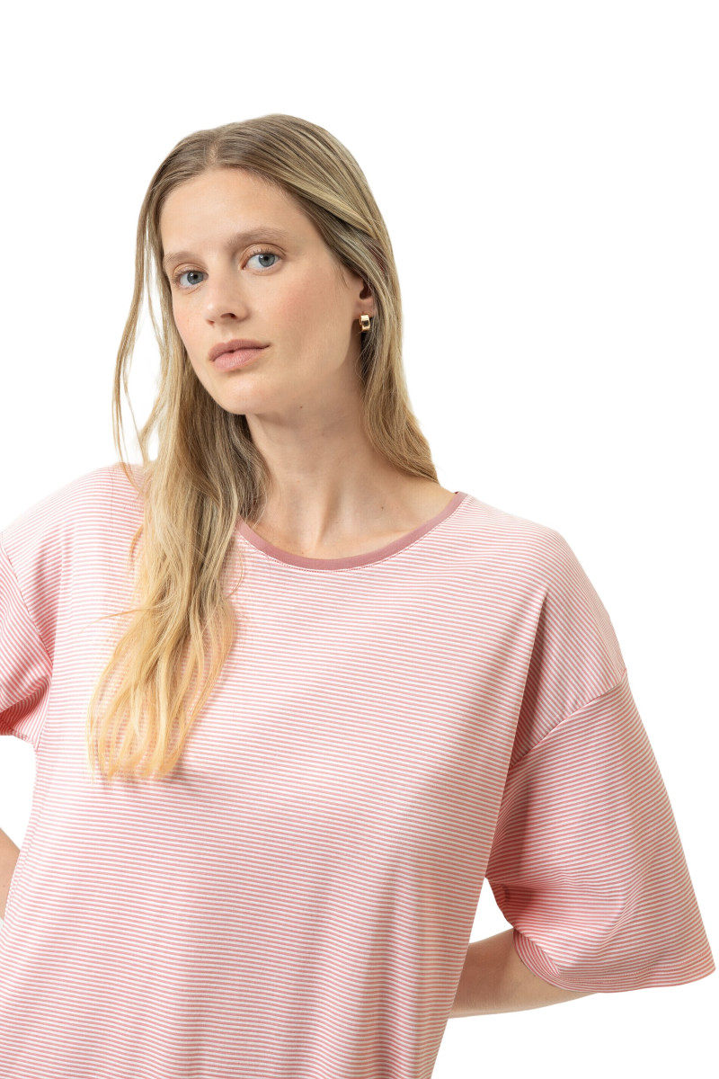 Das weiche Material und der lockere Fall sorgen für ein angenehmes Hautgefühl. Der klassische Rundhalsausschnitt ist mit einem dezent abgesetzten, feinen Rand versehen, was ein subtiles Design-Detail darstellt. Ob als leichtes Nachthemd, Longshirt über Leggings oder als entspanntes T-Shirt-Kleid getragen, dieses Stück ist ein vielseitiger Allrounder für jede Wohlfühl-Garderobe.