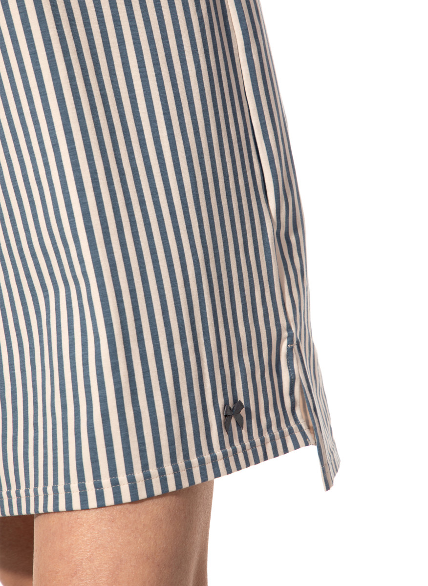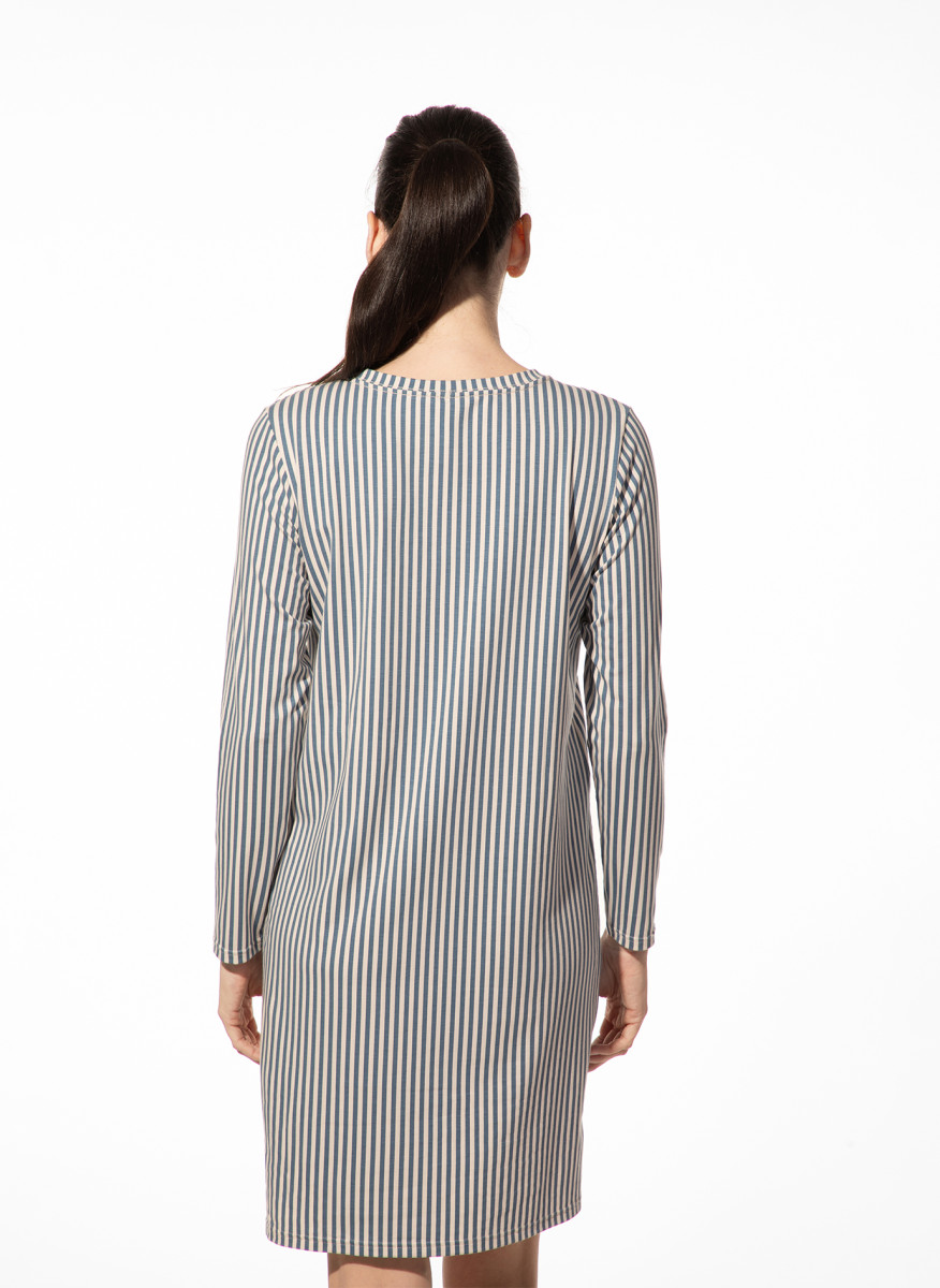 Dieses zeitlose Damenkleid besticht durch sein klassisches Streifenmuster in Blau und Cremeweiß, das dem Look eine frische, maritime Note verleiht. Gefertigt aus weichem, anschmiegsamem Jersey-Material bietet das Kleid nicht nur hohen Tragekomfort, sondern auch eine angenehme Bewegungsfreiheit. Der gerade Schnitt und der Rundhalsausschnitt sorgen für eine unkomplizierte Passform, während die langen Ärmel das Modell auch an kühleren Tagen zu einem idealen Begleiter machen. Ob als gemütliches Homewear-Kleid, luftiges Freizeitoutfit oder stilvolle Loungewear – dieses Kleid vereint Komfort mit einem Hauch von Eleganz.