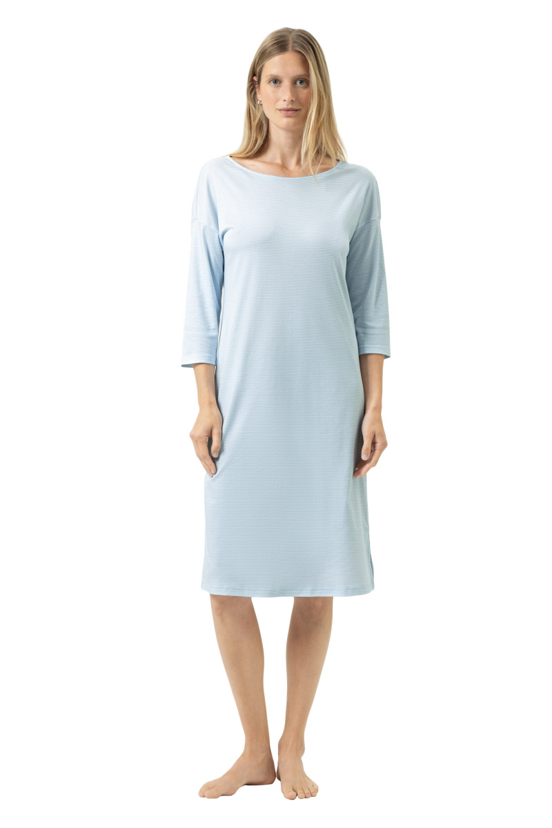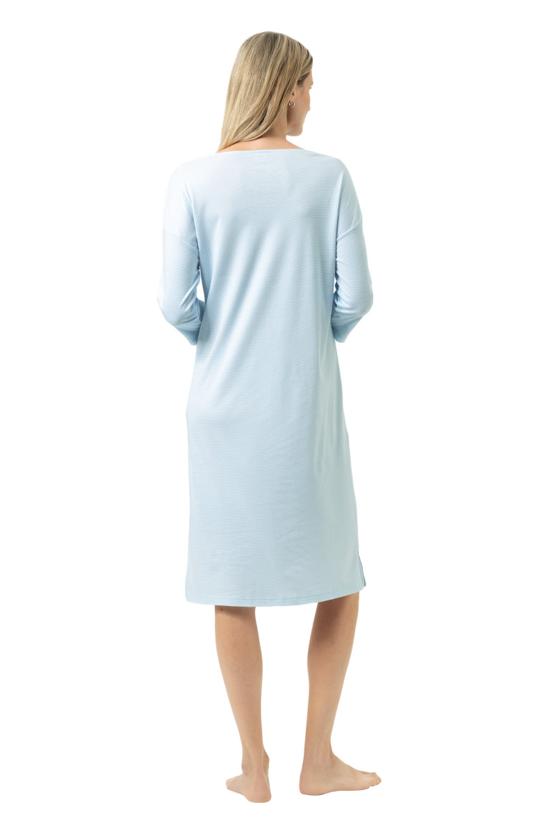 Dieses gestreifte Nachthemd verspricht erholsame Nächte und entspannte Morgenstunden in stilvollem Komfort. Gefertigt aus einem weichen, leichten Jerseymaterial, das sanft die Haut umschmeichelt, bietet es ein exzellentes Tragegefühl und ist besonders atmungsaktiv.