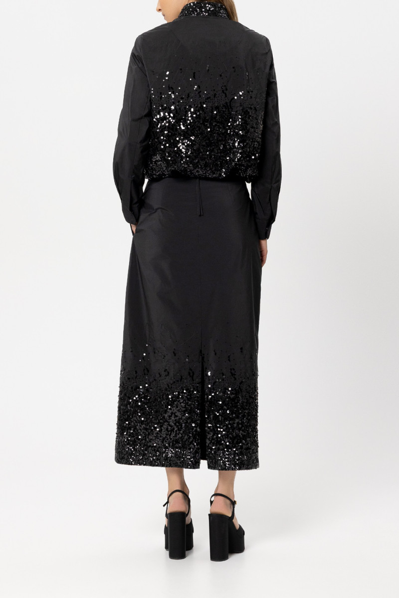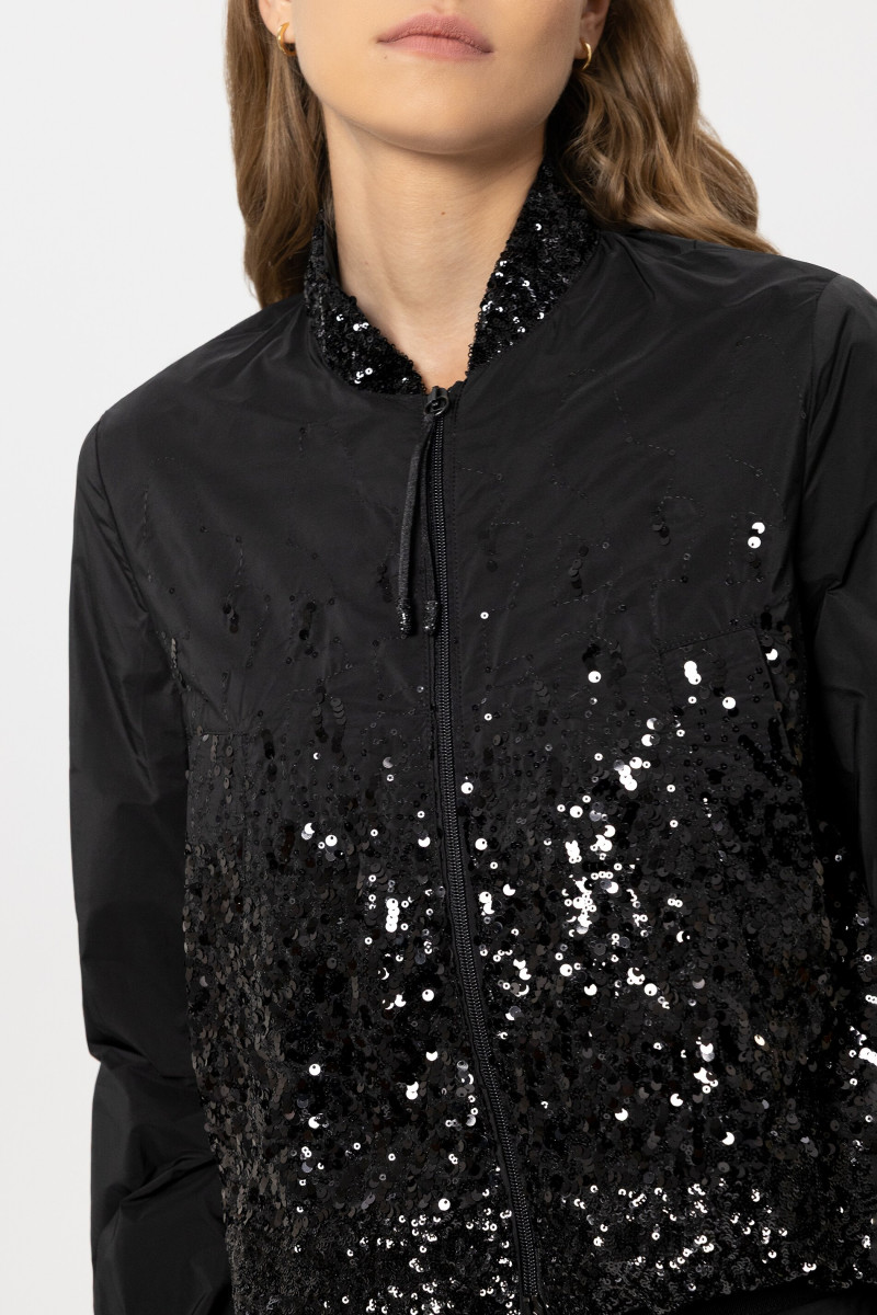 Kurzer, gefütterter Taft-Blouson mit partiellem Pailletten-Besatz und Stehkragen. Praktische Details sind der Zwei-Wege-Frontreißverschluss und der verstellbare Saum. Die Ärmelmanschetten werden mit einem Druckknopf geschlossen. Unser Model ist 178 cm groß und trägt Größe 36. Obermaterial: 100% Polyester Pailletten: Kunststoff Futter: 57% Viskose, 43% Polyester Handwäsche
