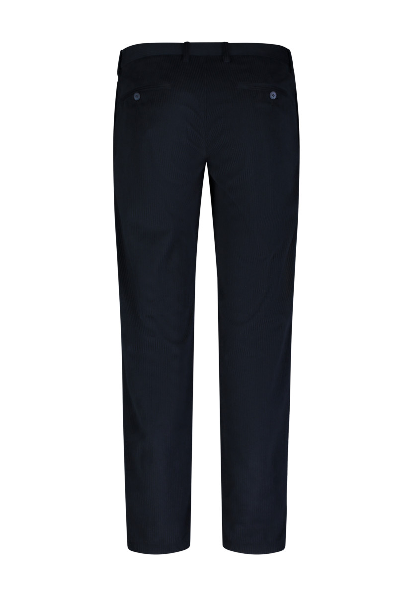 Gefertigt aus einem hochwertigen Material, präsentiert sich die Hose mit einer feinen, kaum sichtbaren vertikalen Streifen- oder Rippenstruktur (vermutlich ein Nadelstreifen oder eine feine Kord-Optik). Diese dezente Textur verleiht dem Stoff eine moderne Tiefe und unterscheidet die Hose von schlichten, glatten Modellen.