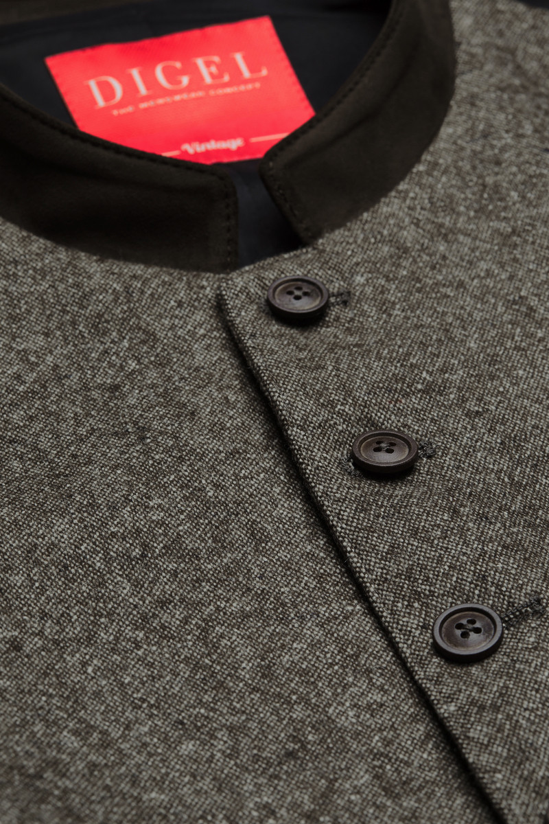 Diese exklusive Weste von DIGEL verleiht Ihrem Outfit eine raffinierte Note. Gefertigt aus hochwertigem, robustem Wollmix in elegantem Fischgrät-Muster, bietet sie Wärme und Komfort bei kühleren Temperaturen. Der Stehkragen aus edlem Kontrastmaterial rundet das Design stilvoll ab.