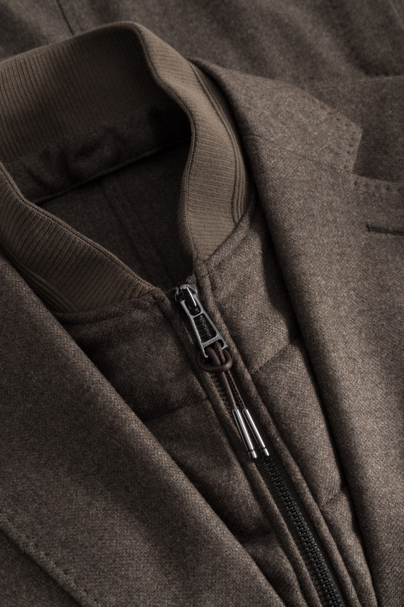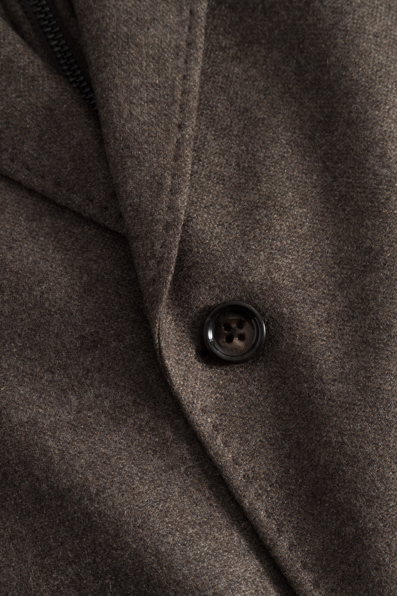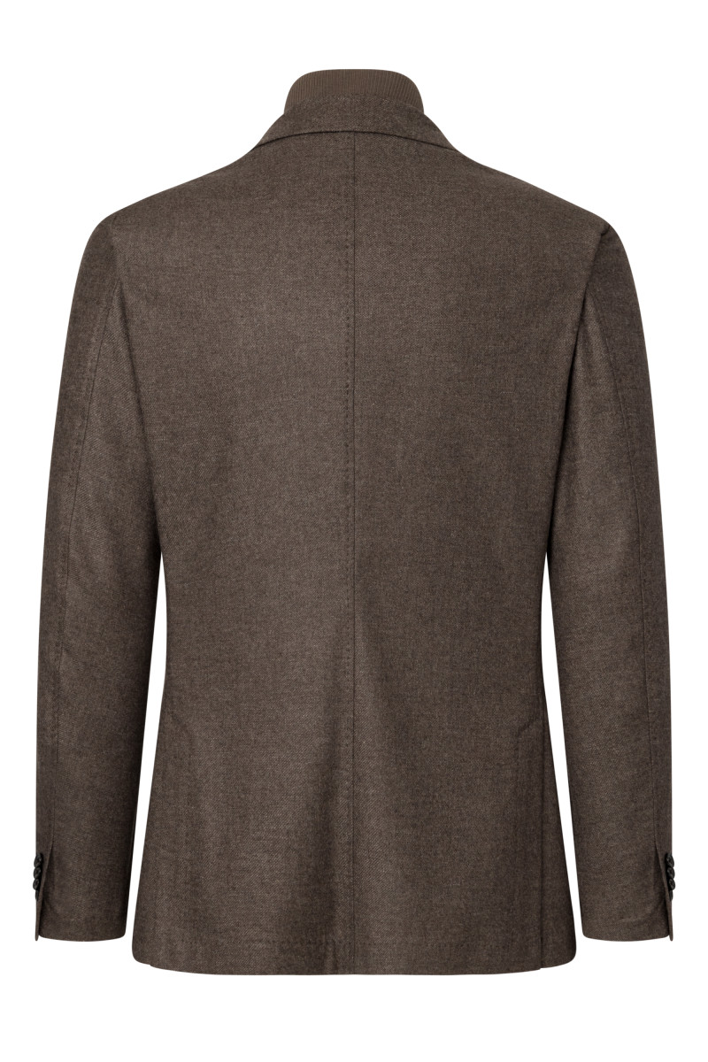 Dieser moderne Sakko-Mantel ist ein stilvolles Hybrid-Kleidungsstück, das die Eleganz eines Sakkos mit der Funktionalität einer Übergangsjacke verbindet. Gefertigt aus einem hochwertigen, strukturierten Tuch, bietet er eine ansprechende Haptik und eine schlichte, melierte Oberfläche. Das Design ist klassisch mit einem Reverskragen und einem Ein-Knopf-Verschluss. Das Besondere ist der integrierte Inlay-Einsatz aus Rippstrick, der mit einem Reißverschluss versehen ist und einen zusätzlichen Stehkragen bietet. Dieser Einsatz kann wärmen und einen sportlichen Akzent setzen, lässt sich aber je nach Anlass auch entfernen. Zwei aufgesetzte Taschen an der Vorderseite unterstreichen den Casual-Chic. Dieses Sakko ist ideal für Business-Casual-Looks oder elegante Freizeit-Outfits in der kühleren Jahreszeit.