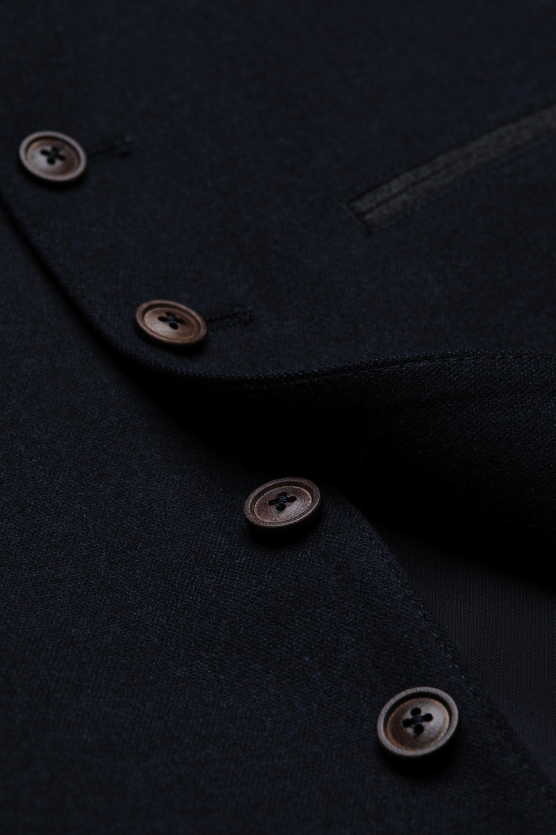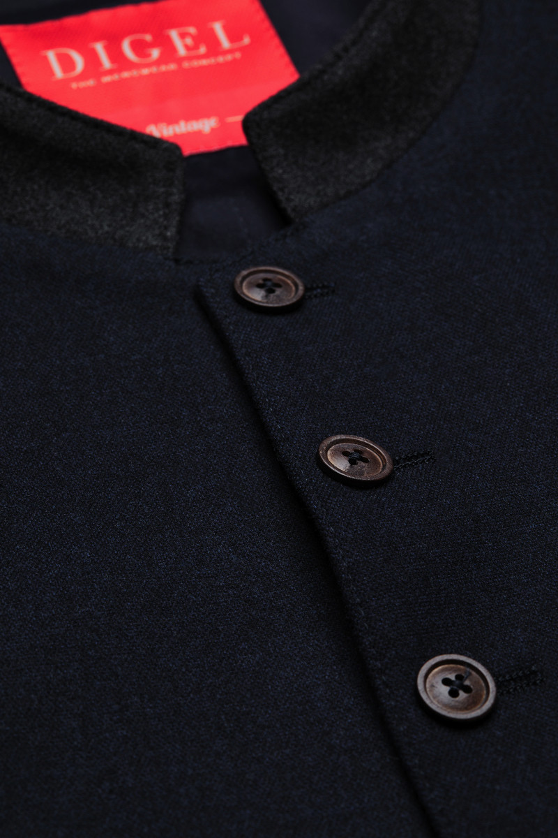 Die elegante Herrenweste von DIGEL aus der „Vintage“-Linie vereint klassisches Design mit moderner Raffinesse und ist ein stilvoller Begleiter für besondere Anlässe oder den gepflegten Alltagslook. In einem tiefen Dunkelblau gehalten, verleiht sie jedem Outfit eine edle Note. Die Weste präsentiert sich mit einem traditionellen Stehkragen, einer durchgehenden Knopfleiste und drei dezent eingearbeiteten Paspeltaschen, die sowohl funktional als auch dekorativ wirken. Der hochwertige Wollmix sorgt nicht nur für eine angenehme Haptik, sondern auch für eine ausgezeichnete Formstabilität und wärmende Eigenschaften – perfekt für die kühleren Monate. Die figurbetonte Passform schmeichelt der Silhouette, während das klassische Design vielseitige Kombinationsmöglichkeiten mit Hemd, Sakko oder Jeans bietet. Ob zur Hochzeit, auf einem Event oder als stilvolle Ergänzung zum Trachten- oder Business-Look – diese Weste ist ein zeitloses Statement für anspruchsvolle Herren mit Sinn für Qualität und Stil.