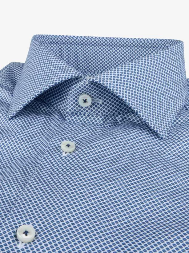 Dieses Twillhemd ist aus Twofold-Cotton-Qualität mit Mikromuster gefertigt. Das Hemd hat Perlmuttknöpfe, einfache Manschetten und einen Cutaway-Kragen.
