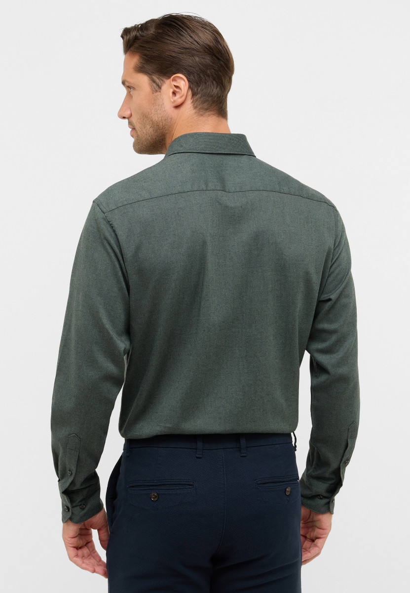 Dieses dunkelgrüne Stretch-Hemd ist die perfekte Wahl für alle, die Stil und Komfort vereinen möchten. Kombinieren Sie es mit einer beigen Chino für einen Smart-Casual-Look oder unter einem Anzug für ein modernes Business-Statement.