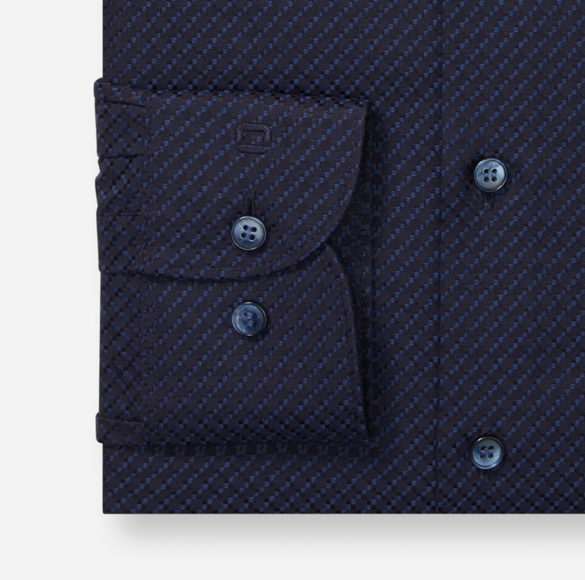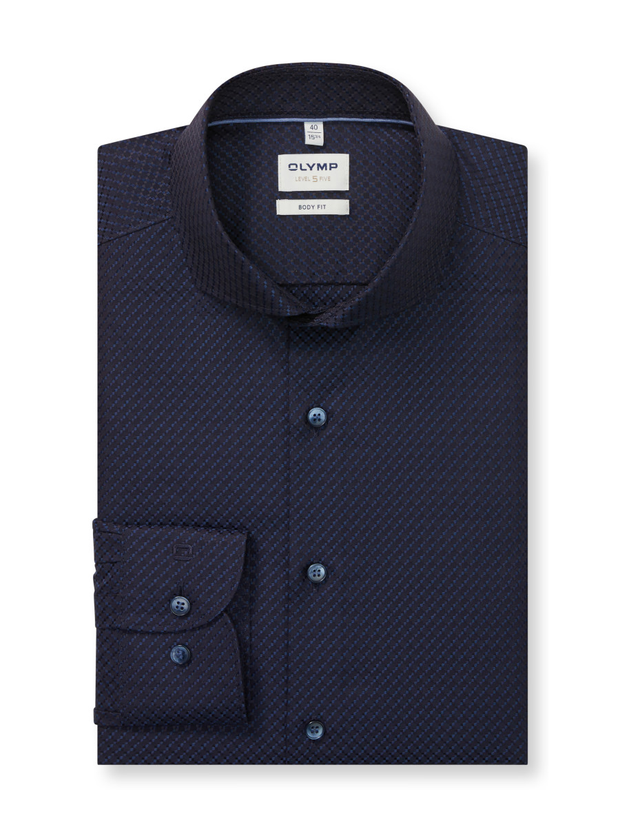 Reichhaltige Strukturen in tiefem Marine unterstreichen den stilvollen Business-Look, der körperbetonte Body Fit sorgt für die dynamische Performance – das einfarbige OLYMP Level Five Men's Club mit raffiniertem Changé empfiehlt sich für spezielle Events. Der modisch markante Haifischkragen setzt den attraktiven Akzent. Bügelleicht.