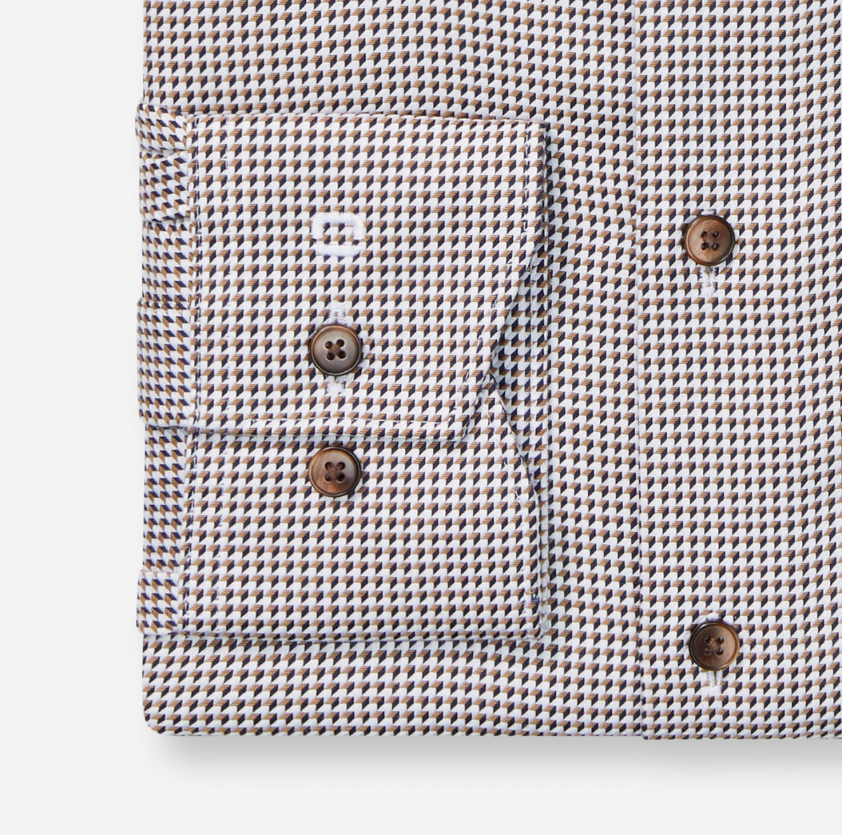 Klassisches Hahnentritt-Karo in Braun und dynamisch sportive Linienführung: Das OLYMP Luxor modern fit Men's Club Businesshemd überzeugt mit 100 Prozent Baumwollanteil, natürlicher Dehnbarkeit und hautsympathischer Atmungsaktivität. Feine Garne sorgen für den unnachahmlichen Griff. Pflegeleichtes und bügelfreies Handling. Souveräner Royal Kent.