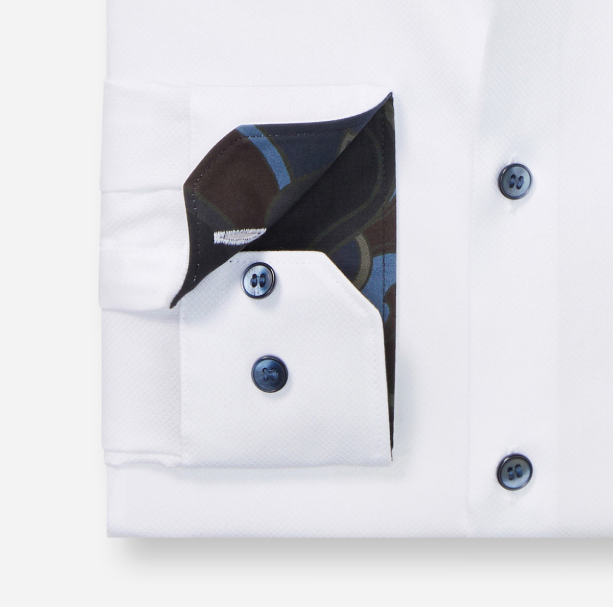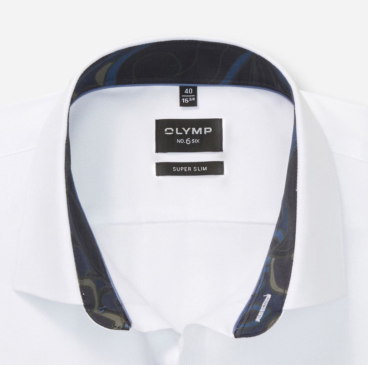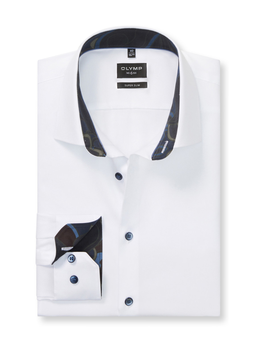 Elegantes OLYMP No. Six mit Schaftmuster in Nachtblau. Die Kombination aus klassischer Optik und stark tailliertem Super Slim Fit macht dieses Hemd zur perfekten Wahl für jung-dynamische Businessmänner. Akzentuiert wird der Look durch modische Kontrastbeschläge an Manschetten und New-York-Kent-Kragen. In trageangenehmer Comfort-Stretch-Qualität.