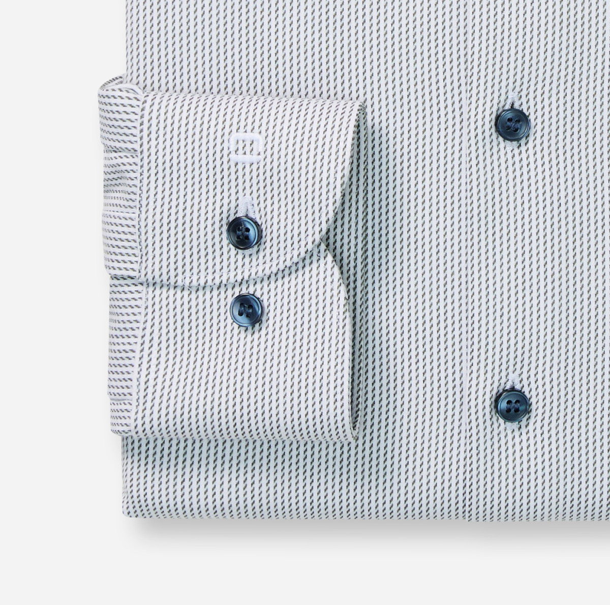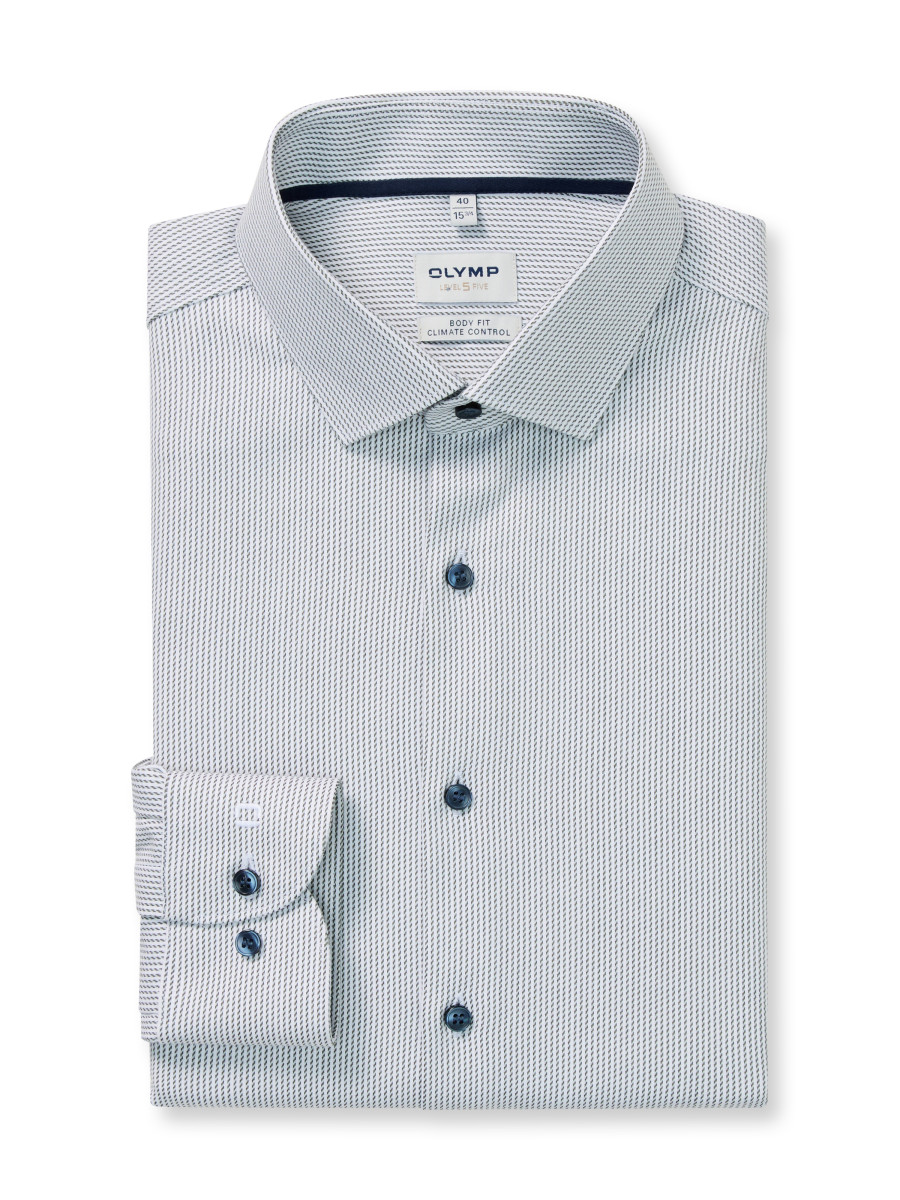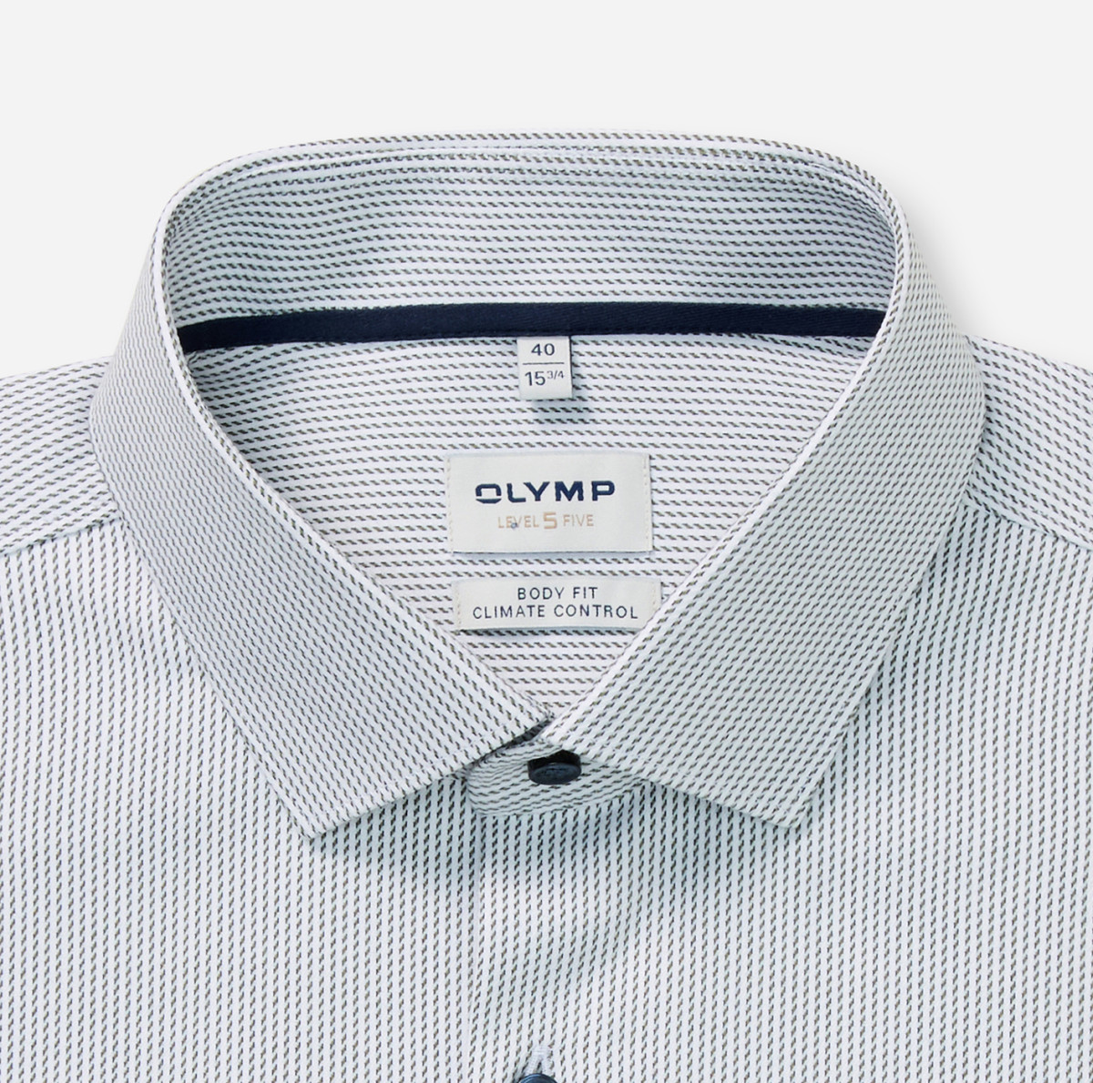 Dieses Hemd aus der Serie OLYMP Level Five kombiniert eine kompromisslos moderne Passform mit herausragender Funktion. Es richtet sich an den schlanken, modebewussten Herrn, der auch bei einer körperbetonten Garderobe nicht auf höchsten Komfort verzichten möchte. Die Passform Body Fit ist stark tailliert und sorgt für eine figurbetonte, zeitgemäße Silhouette, die unter einem Sakko oder solo eine gute Figur macht.