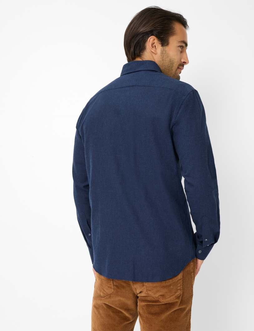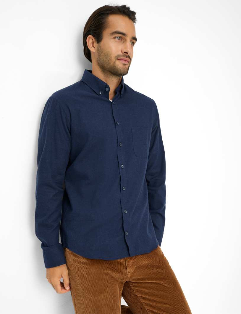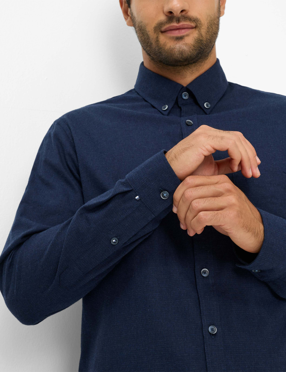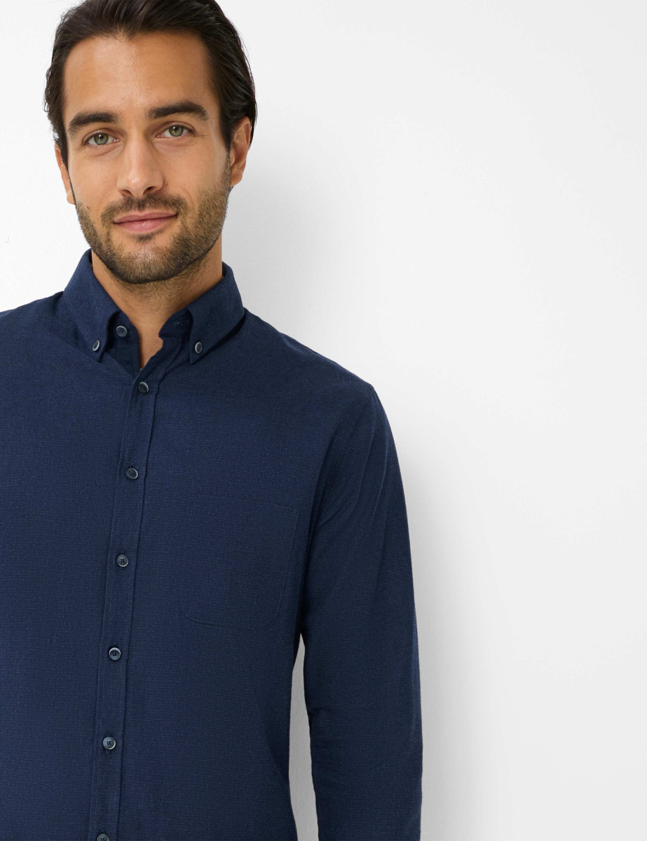 Dieses klassische Hemd von Brax präsentiert sich in einem stilvollen, dunklen Blau mit einem dezenten Muster, das eine edle und zugleich zeitlose Optik verleiht. Der Button-Down-Kragen und die durchgehende Knopfleiste sorgen für ein gepflegtes Erscheinungsbild, während die Brusttasche auf der linken Seite dem Hemd eine praktische Note verleiht.
