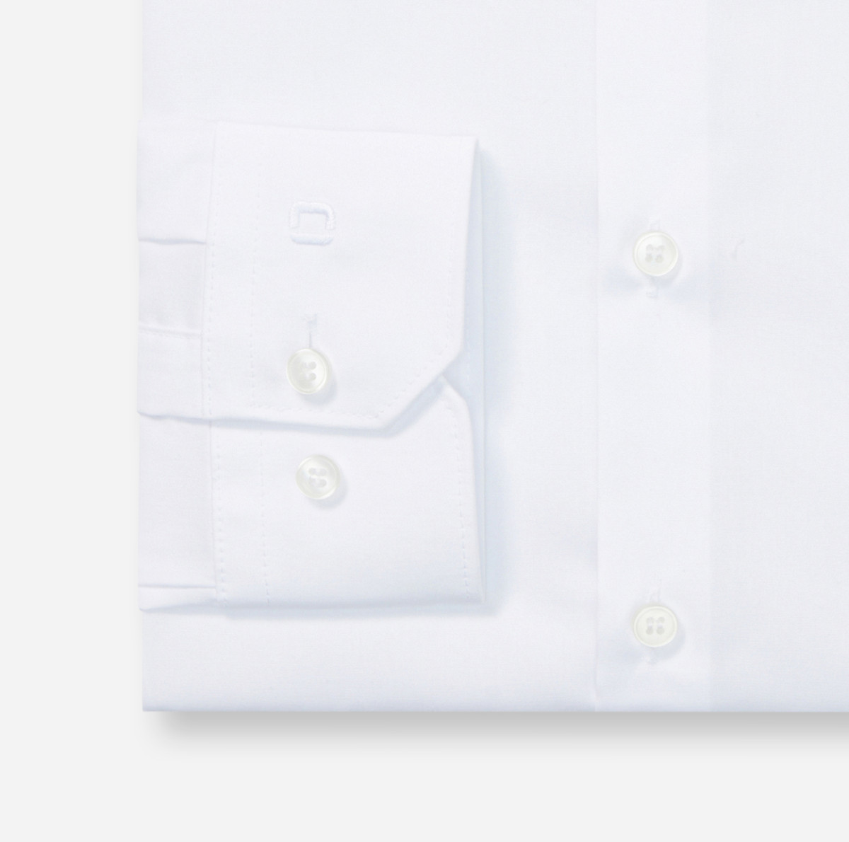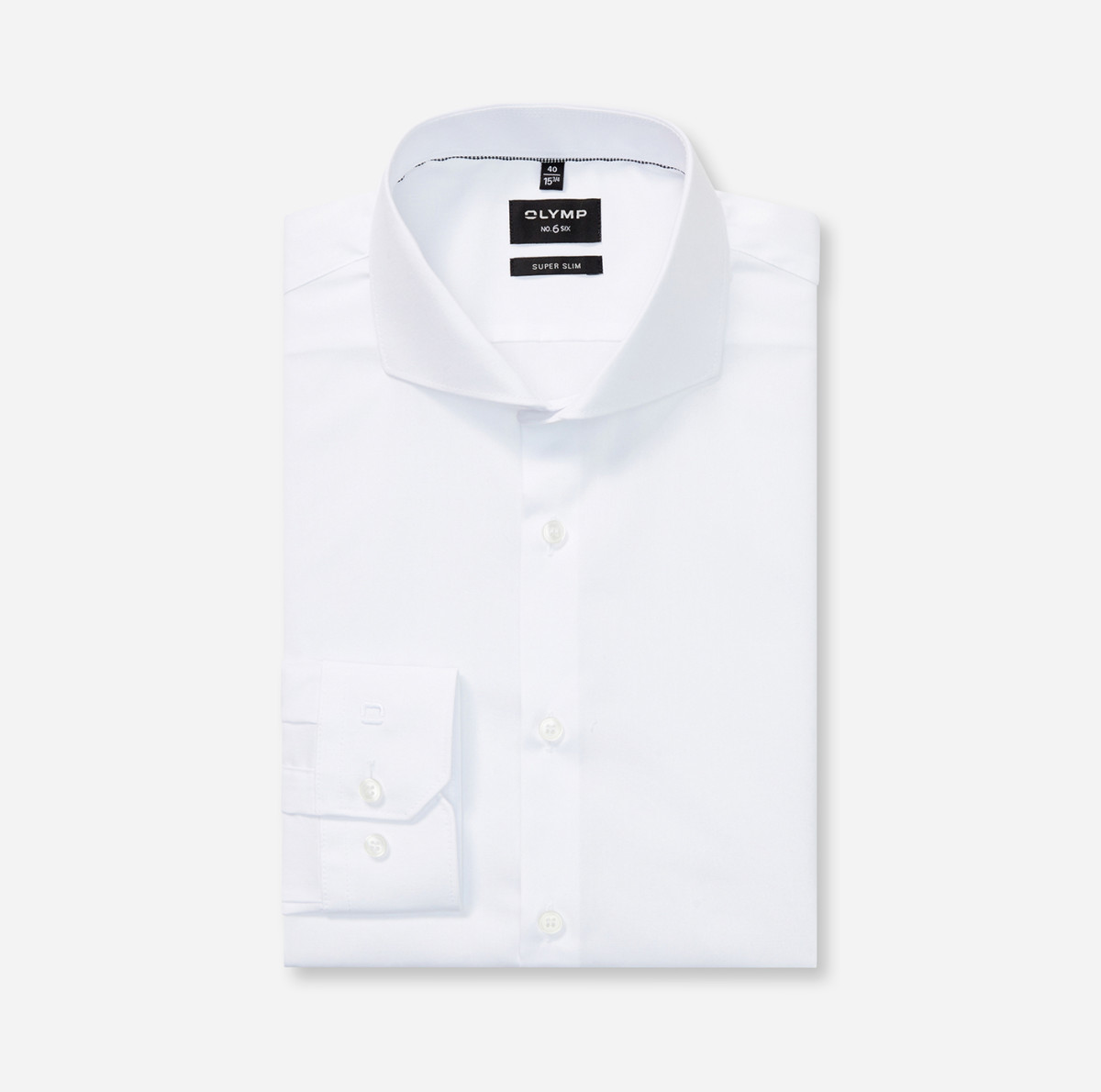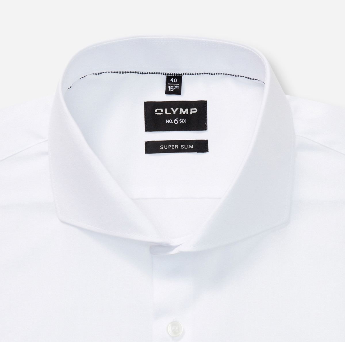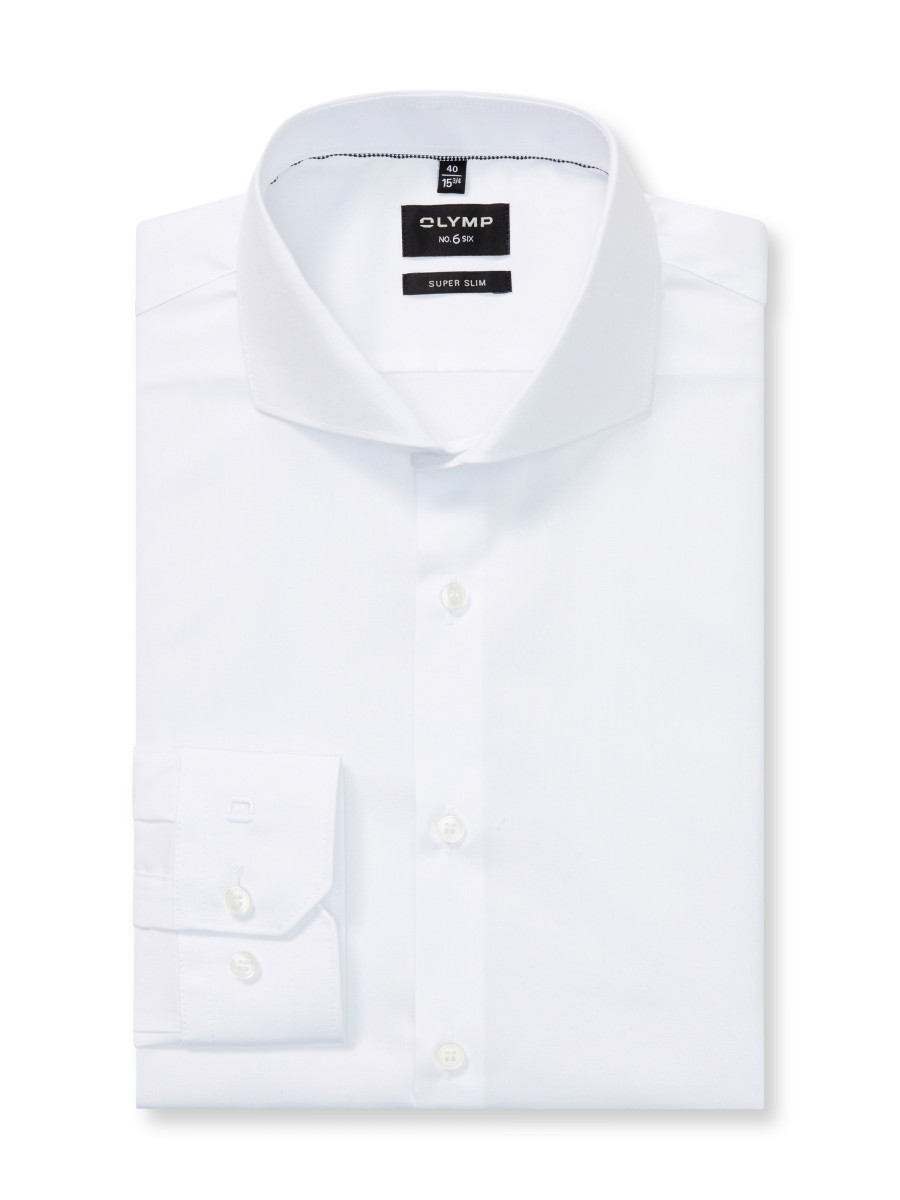Der Trend der Stunde heißt: schlanke Schnittführung. Denn junge, modebewusste Männer sind heute nicht nur immer trainierter und damit schlanker. Sie wollen ihr neues Körpergefühl auch zeigen. Speziell für diese figurbewussten und superschlanken Männer ist das sehr stark taillierte und körpernahe Weiße Businesshemd der Linie OLYMP No. Six super slim bestens geeignet. Der extreme Haifisch-Kragen, die abgerundeten Kombimanschetten und die schmale Knopfleiste unterstreichen außerdem das angesagte Outfit für den sportlichen Mann im OLYMP.