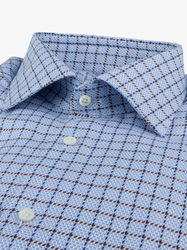 Dieses karierte Twillhemd besteht aus Twofold-Cotton-Qualität. Das Hemd hat Perlmuttknöpfe, einfache Manschetten und einen Cutaway-Kragen.