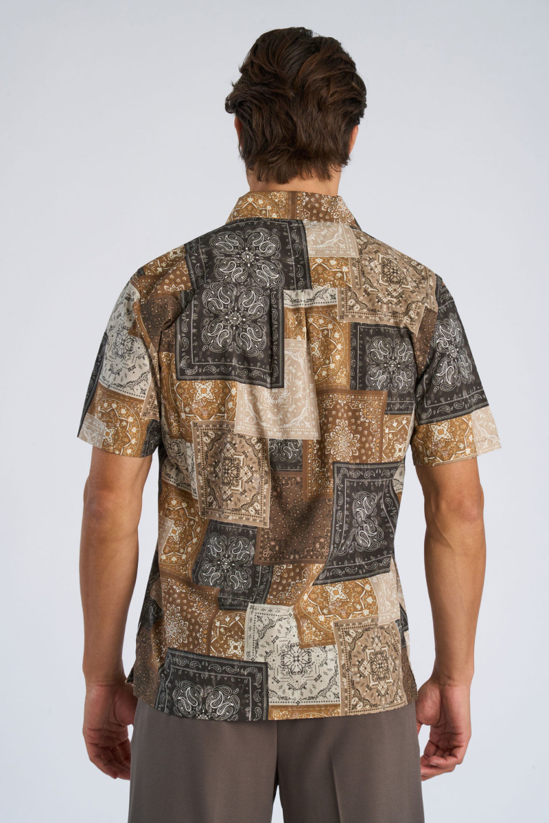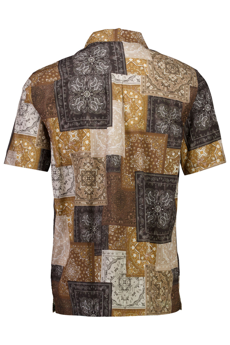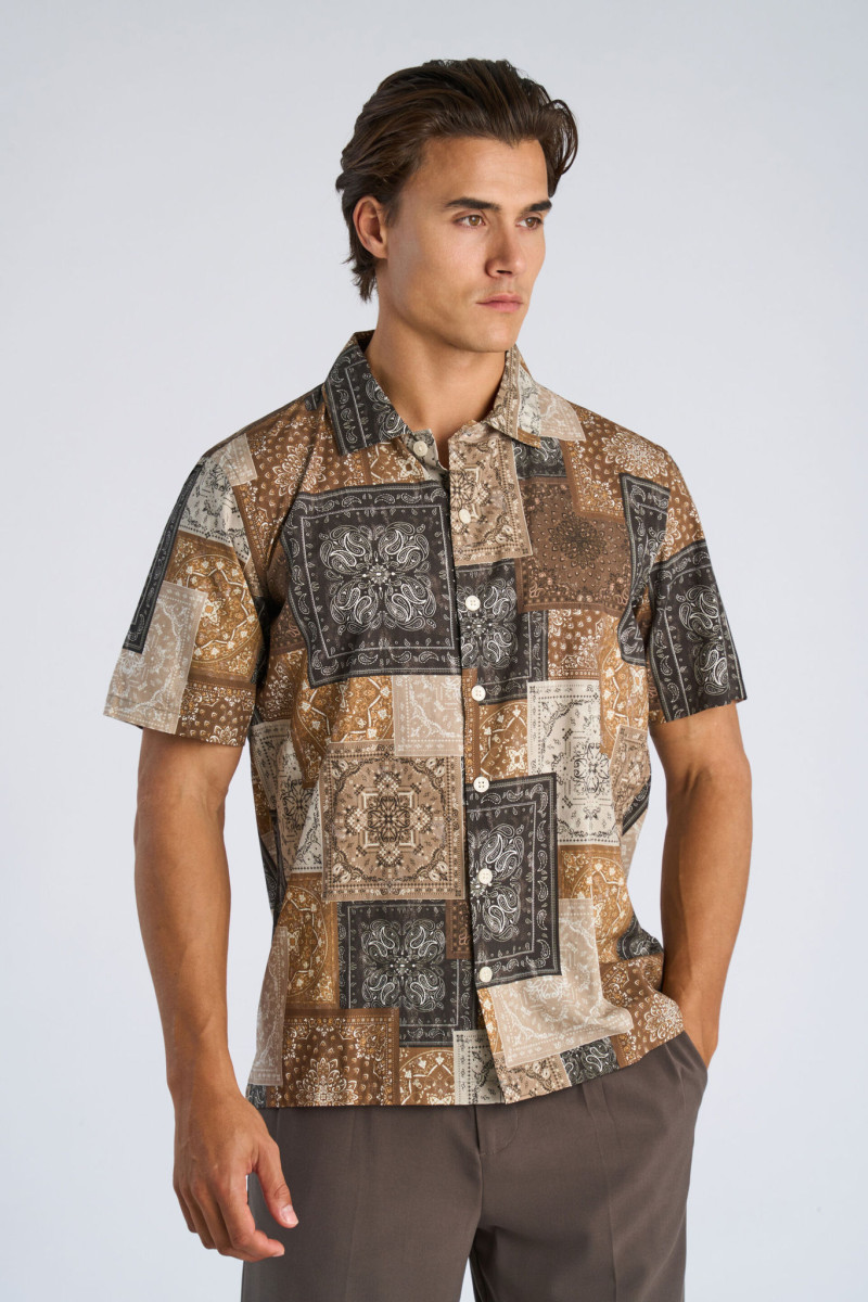 Shirt aus einer bequemen Baumwollmischung mit Modal. Das Shirt ist gemustert, kurzärmelig und hat einen kleinen Logo-Patch unten links. Gefertigt im Regular Box Fit, was eine Standardpassform mit geradem Schnitt bedeutet.