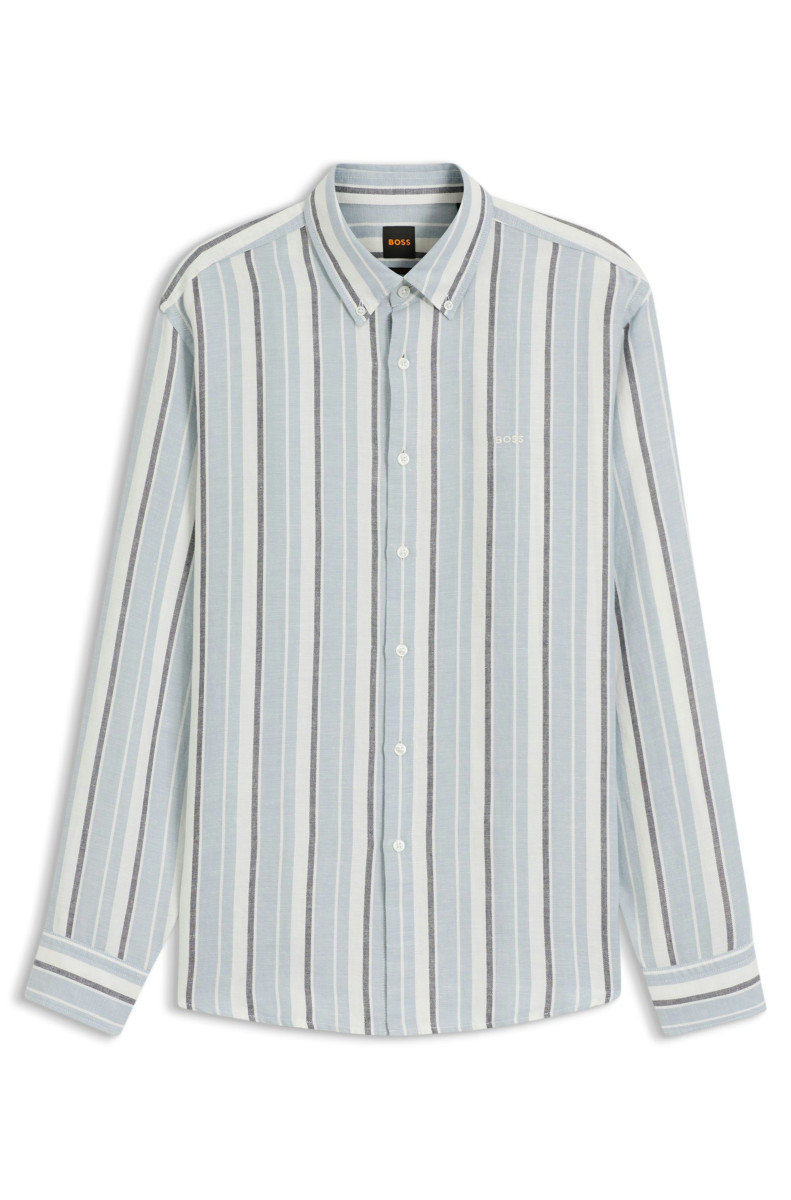 Gerade geschnittenes BOSS Hemd aus einem Leinen-Baumwoll-Mix mit sommerlichen Streifen. Button-Down-Kragen. Logo-Stickerei.