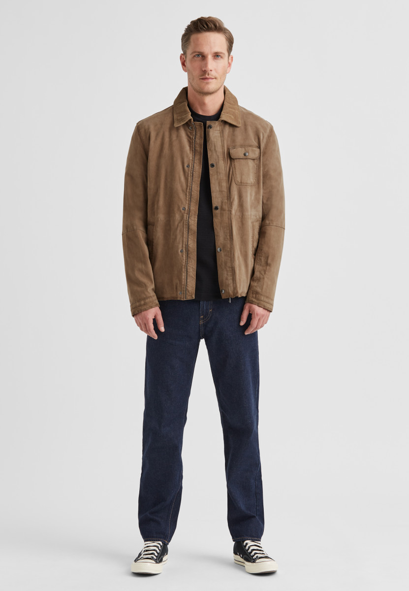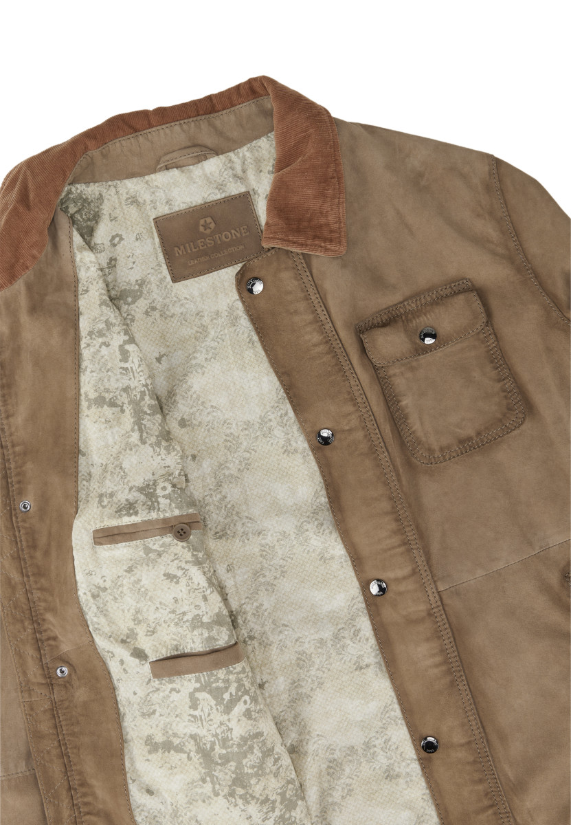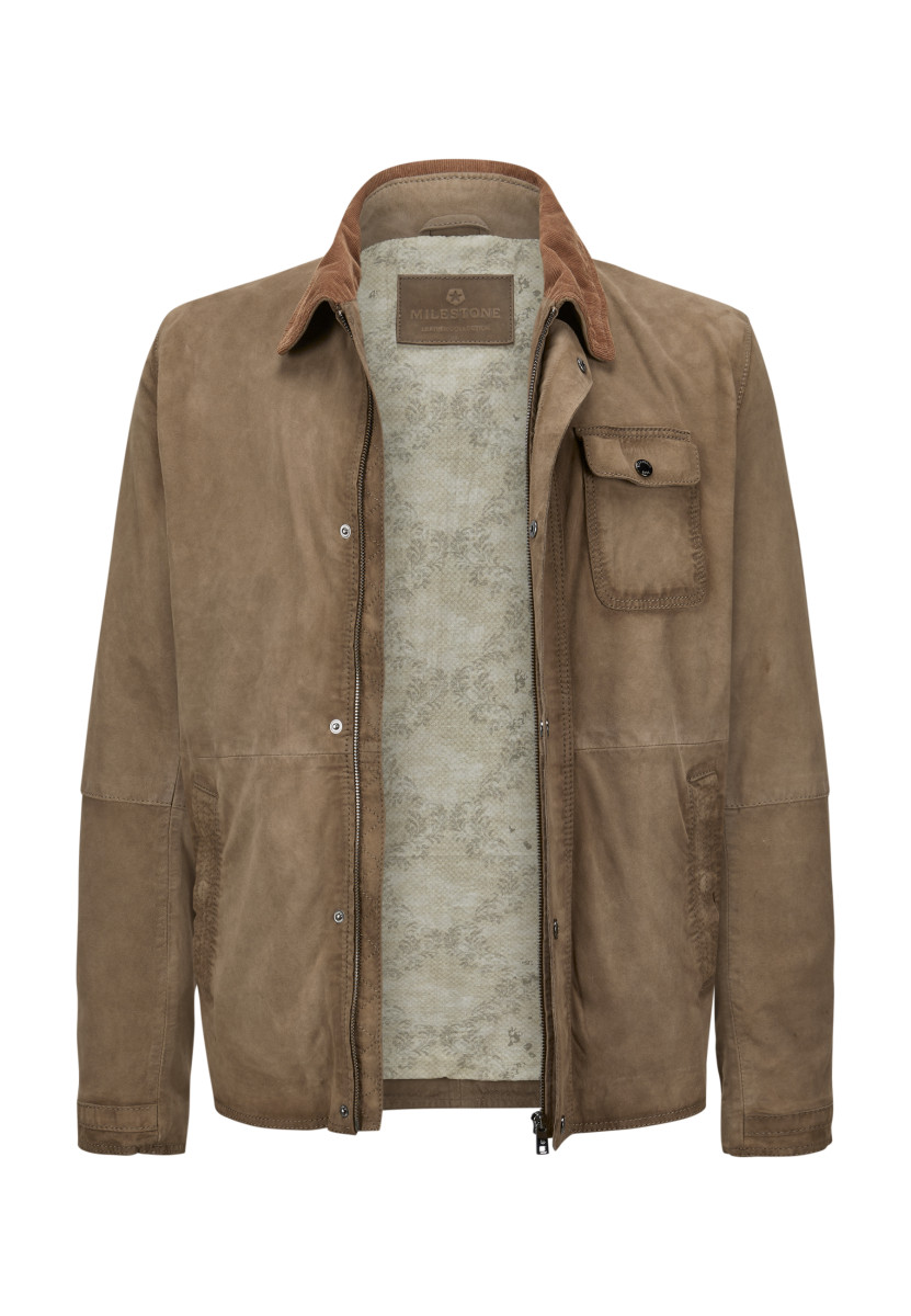 Milestone schafft mit dieser urbanen und soften Lederjacke aus edlem Ziegenvelours ein vielseitiges und langlebiges Outdoor-Piece im lässigen traditionellem Brit Design. • Gerader Schnitt | Geschmeidiges Ziegenvelours Leder mit Vintage Effekt | Umlegekragen, Brust Patten und Ärmelabschlüsse innen mit Cord Besatz | Schließt mit verdecktem Reißverschluss und Druck-Knopfleiste | Geknöpfte Brusttasche | Seitliche Leistentaschen mit Drucker schließbar | Praktische Innentaschen | Gefütterte Verarbeitung (leichtes Baumwollfutter mit Floralprint)
