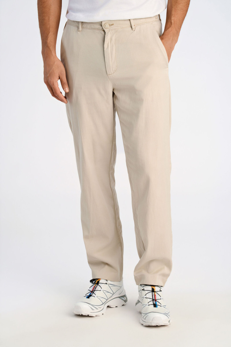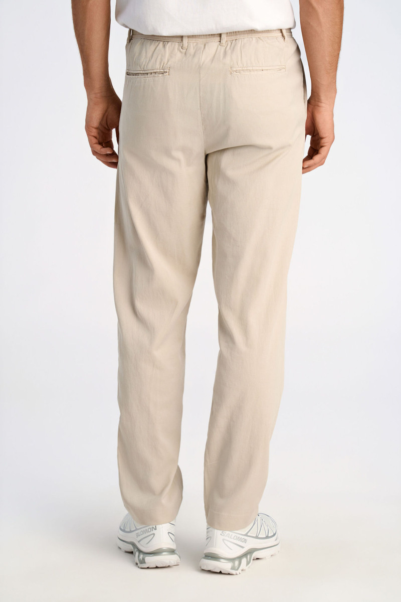 Hose aus einem angenehmen Baumwoll-Tencel-Mix, der temperaturausgleichend und atmungsaktiv ist. Die Hose hat zwei Seitentaschen und zwei Paspeltaschen hinten. Schließt mit einem Knopf und einem verdeckten Reißverschluss sowie mit einem Gummiband an der Rückseite der Taille. Relaxed fit