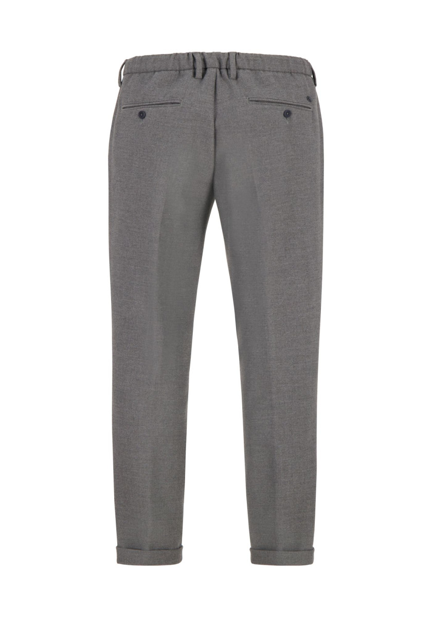Bundfalte | Elastikbund an der Hinterhose | Weitenregulierbarem Tunnelzug, kann innen und außen gebunden werden | Seitliche Einschubtaschen | Geknöpfte Gesäßtaschen | Saumumschlag | Tapered Fit | Gürtelschlaufen | Material-Mix