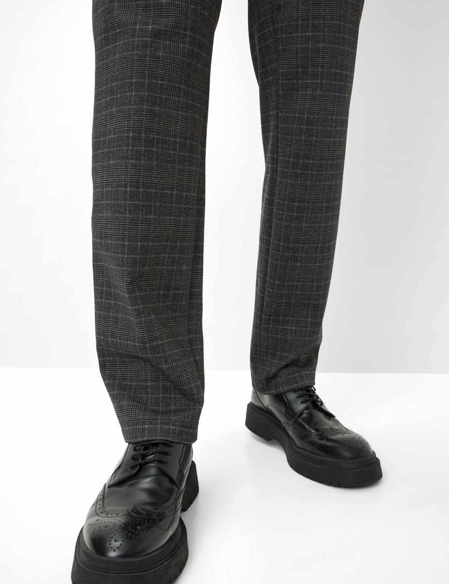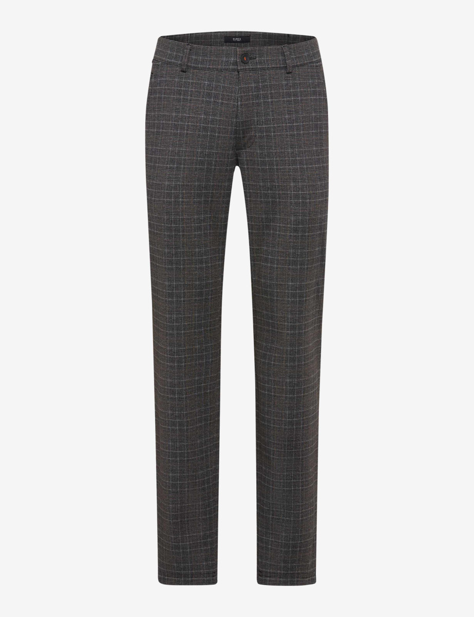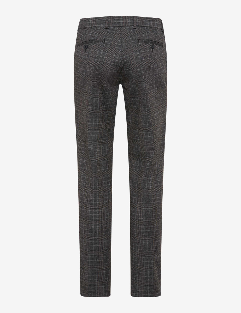 Ein stilvoller Look für kalte Tage gelingt mit der Chino im Style THILO – eine maskuline Hose, die mit smartem Design und wintertauglichem Komfort punktet. Die gerade geschnittene Silhouette im Regular Fit schafft eine moderne Form mit angenehmer Passform. Dank der Perfect Cut-Schnittführung, mit vorne verkürzter und hinten erhöhter Leibhöhe, kneift, rutscht und nervt nichts. Der cleane Look wird durch ein klassisches Karomuster in gedeckter Farbigkeit akzentuiert und von französischen Taschen sowie einer dezent integrierten Tresortasche ergänzt. Ein komfortabler Stretchdehnbund erhöht die Bewegungsfreiheit und unterstreicht den entspannten Charakter dieser Flatfronthose. Der hochwertige Jersey bringt dabei nicht nur optisch Struktur ins Spiel, sondern sorgt zugleich für angenehme Wärme. Dank der soften Materialkombination aus Polyester, Viskose und Elasthan erhält die Herrenhose ihre formbeständigen, pflegeleichten und zugleich anschmiegsamen Eigenschaften. Die softe Innenseite trägt sich angenehm direkt auf der Haut und unterstreicht die Funktionalität der Ausstattung. Das Ergebnis: Eine smarte Chinohose, die lässigen Chic mit komfortabler Alltagstauglichkeit verbindet.