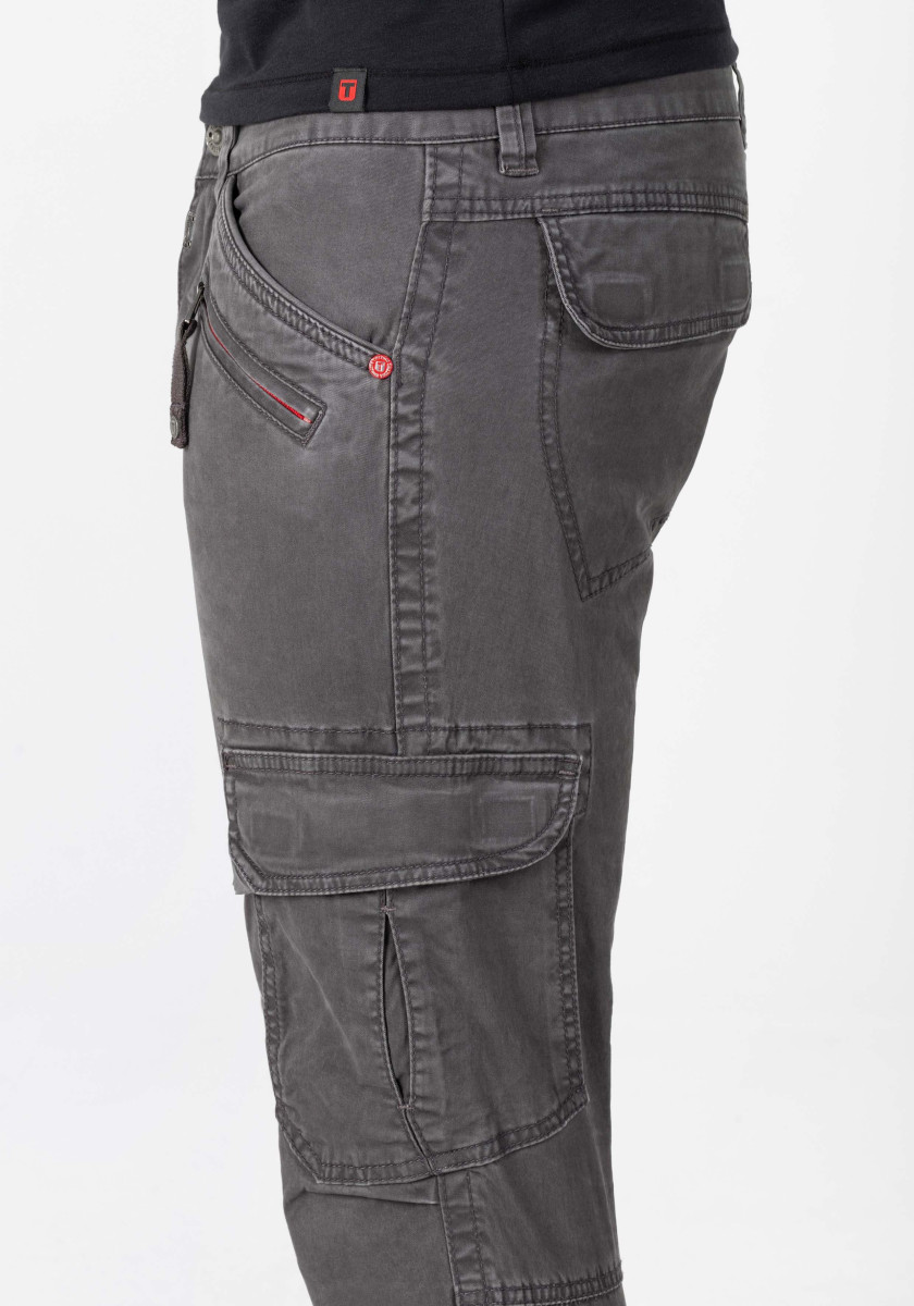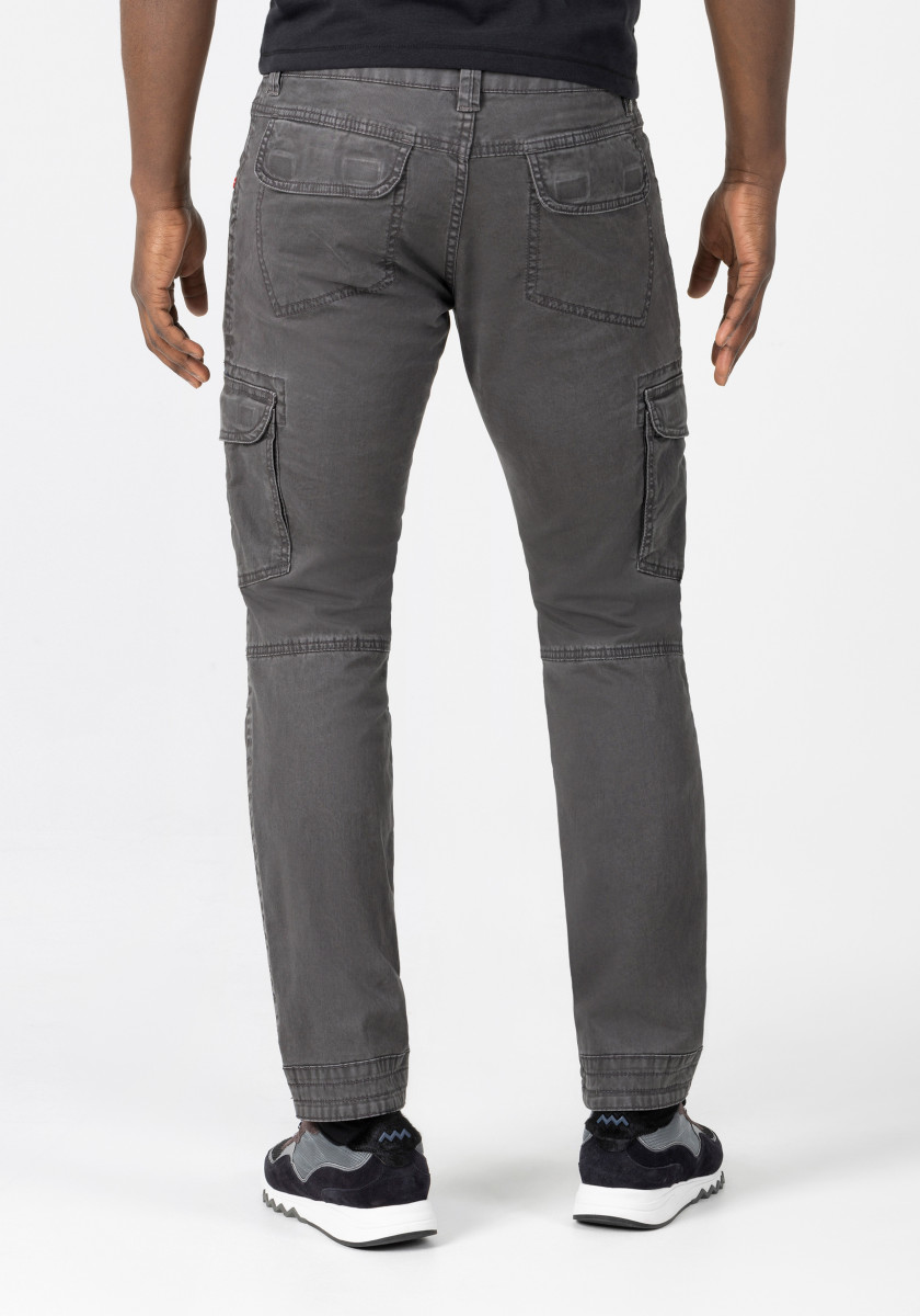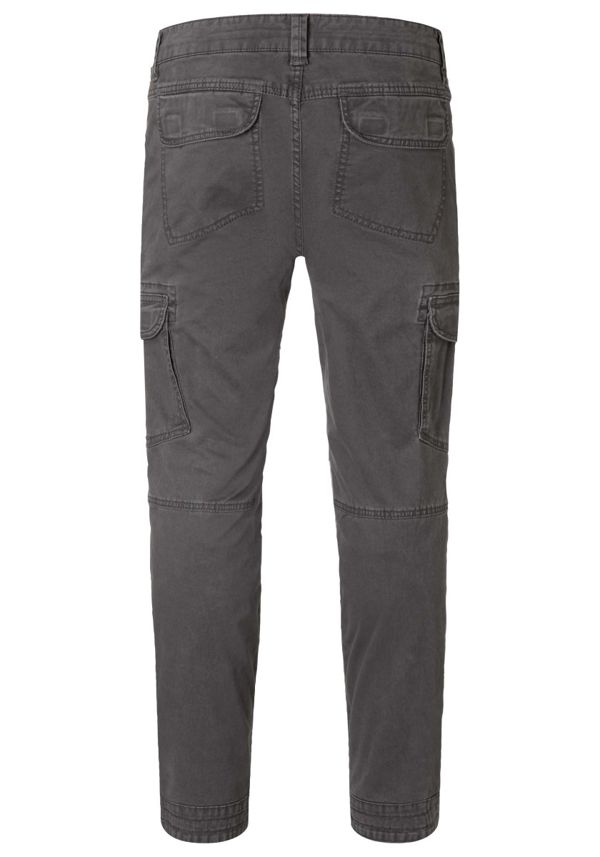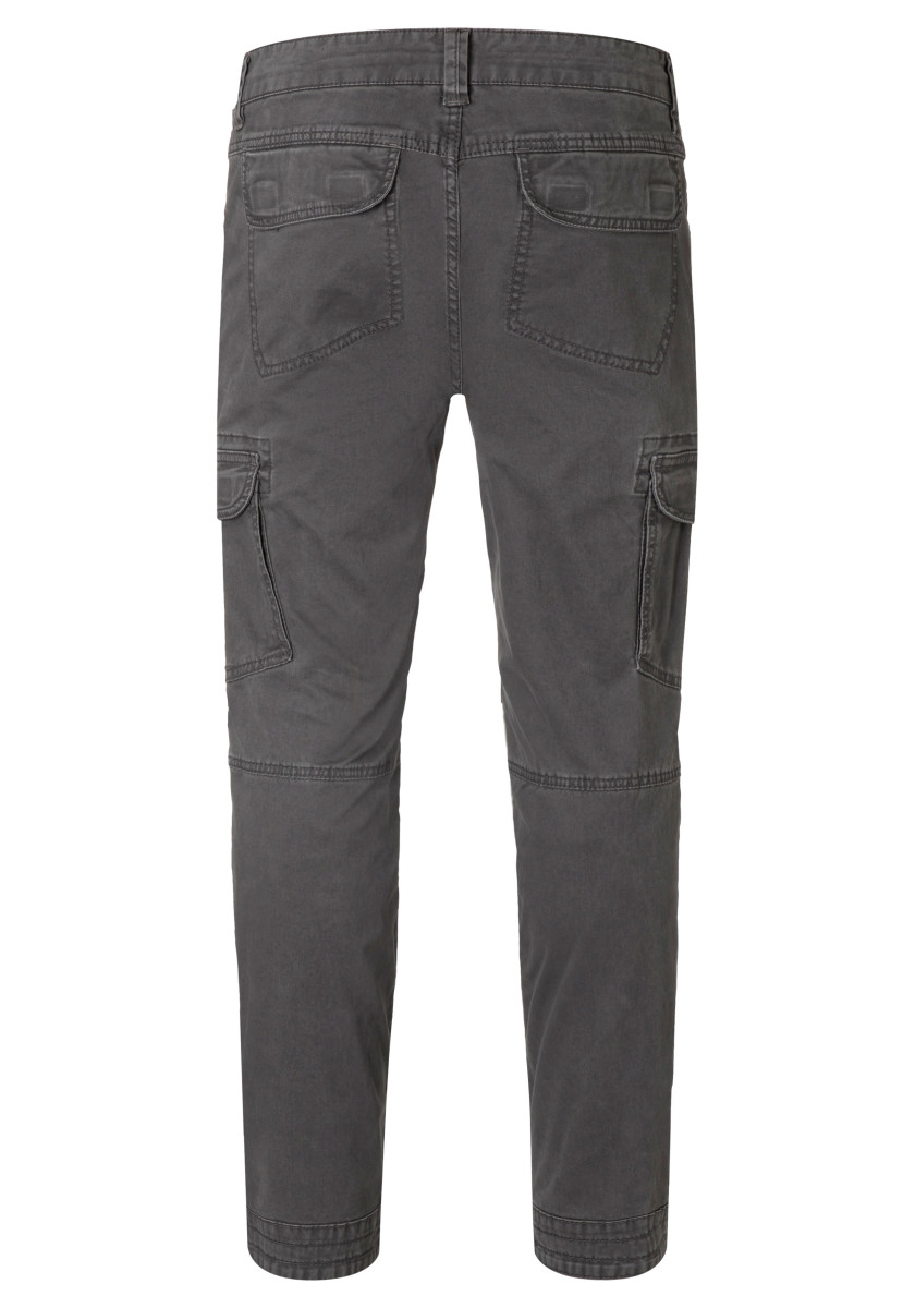 Von der Workwear inspiriert und alltagstauglich re-designt: Cargo-Hosen. Dieses Modell ist aus einer stretchigen, kernigen und gepeachten Dobby-Qualität in gewaschenem Baumwolle-Mix gefertigt. Mit toughen Verarbeitungs-Details, markanten Absteppungen und einer ausgearbeiteten, leicht vorgeformten Knie-Partie. Praktisch und charakteristisch: Zwei schräge Eingrifftaschen mit Münztasche, eine Zipper-Tasche, zwei Cargo-Klappentaschen an den Seiten und zwei untersteppte Klappen-Taschen auf dem Gesäß.