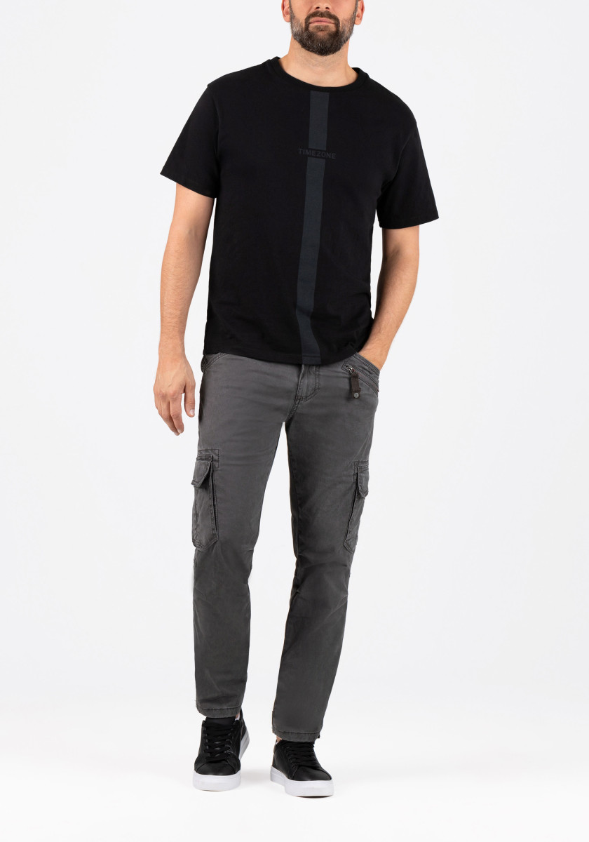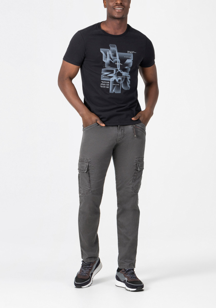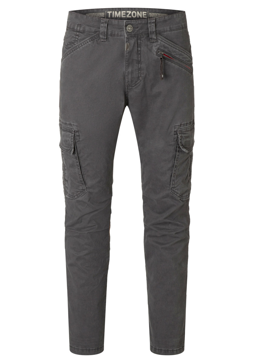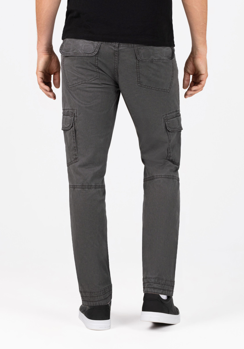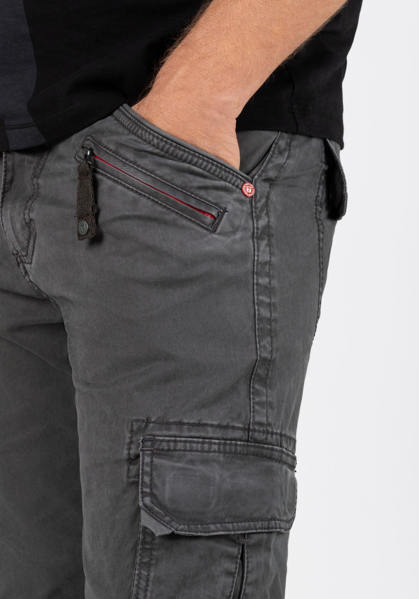 Von der Workwear inspiriert und alltagstauglich re-designt: Cargo-Hosen. Dieses Modell ist aus einer stretchigen, kernigen und gepeachten Dobby-Qualität in gewaschenem Baumwolle-Mix gefertigt. Mit toughen Verarbeitungs-Details, markanten Absteppungen und einer ausgearbeiteten, leicht vorgeformten Knie-Partie. Praktisch und charakteristisch: Zwei schräge Eingrifftaschen mit Münztasche, eine Zipper-Tasche, zwei Cargo-Klappentaschen an den Seiten und zwei untersteppte Klappen-Taschen auf dem Gesäß.